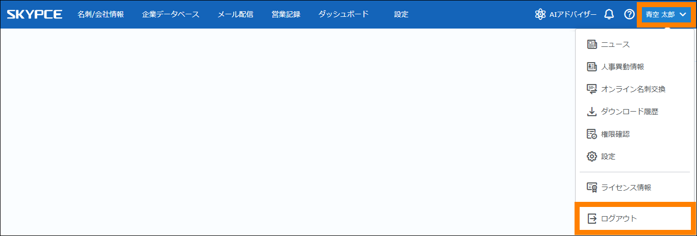ログアウトする場合は、ログイン中のユーザー名をクリックし、「ログアウト」をクリックしてください。