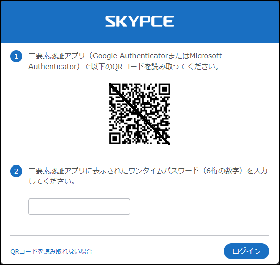 - 管理者によって二要素認証が有効に設定されている場合、「SKYPCE(名刺管理)」への初回ログイン時、または管理者によって二要素認証のリセットが実行されたときは、次の「初期設定画面」が表示されます。「二要素認証で使用するアプリ」を使ってQRコードを読み取り、表示されたワンタイムパスワードを「初期設定画面」で入力してください。
