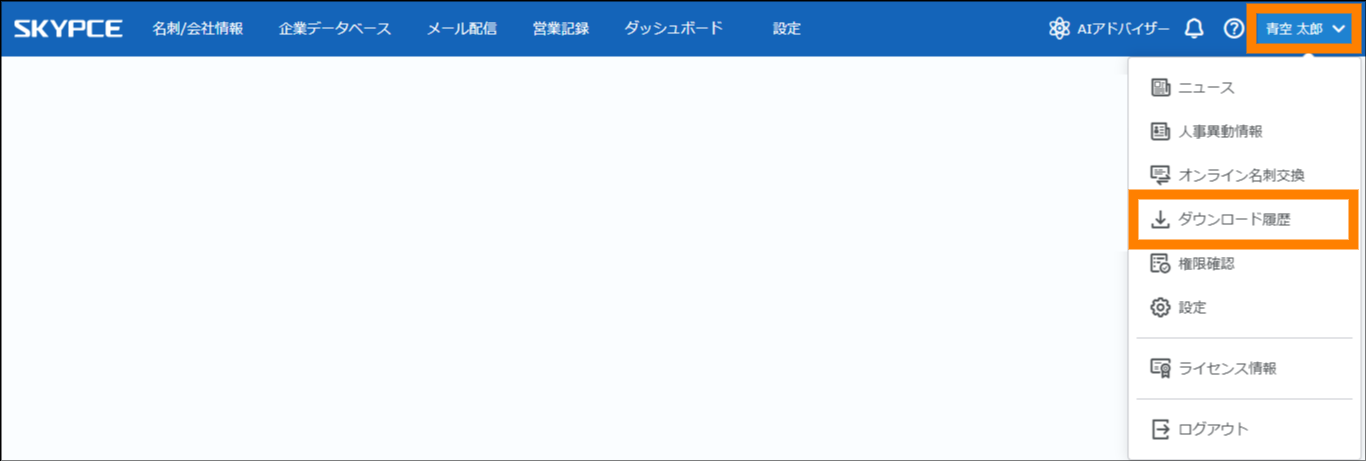 ① ユーザー名をクリックし、「ダウンロード履歴」をクリックする。