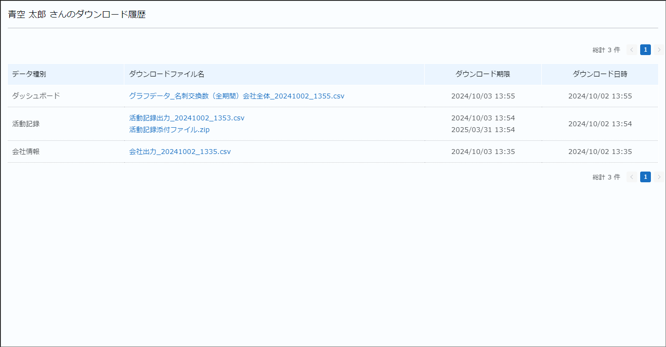 CSV形式のファイルなどでデータをダウンロードした履歴を確認します。ダウンロードのファイル名をクリックすることで、ファイルのダウンロードを行えます。
