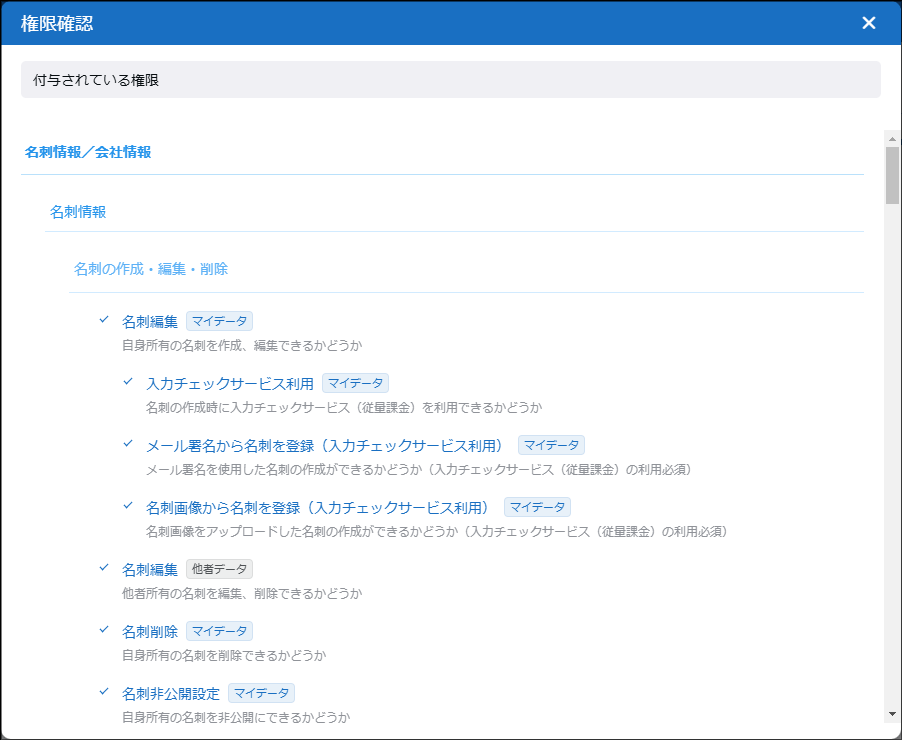 「権限確認」画面では、自分に付与されている権限のみ表示されます。