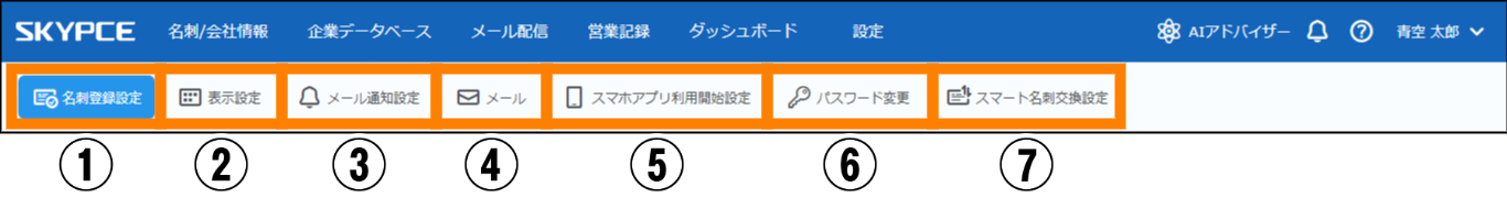 | ⑦ | スマート名刺交換設定 | スマート名刺交換の設定ができます。 | 参照 |