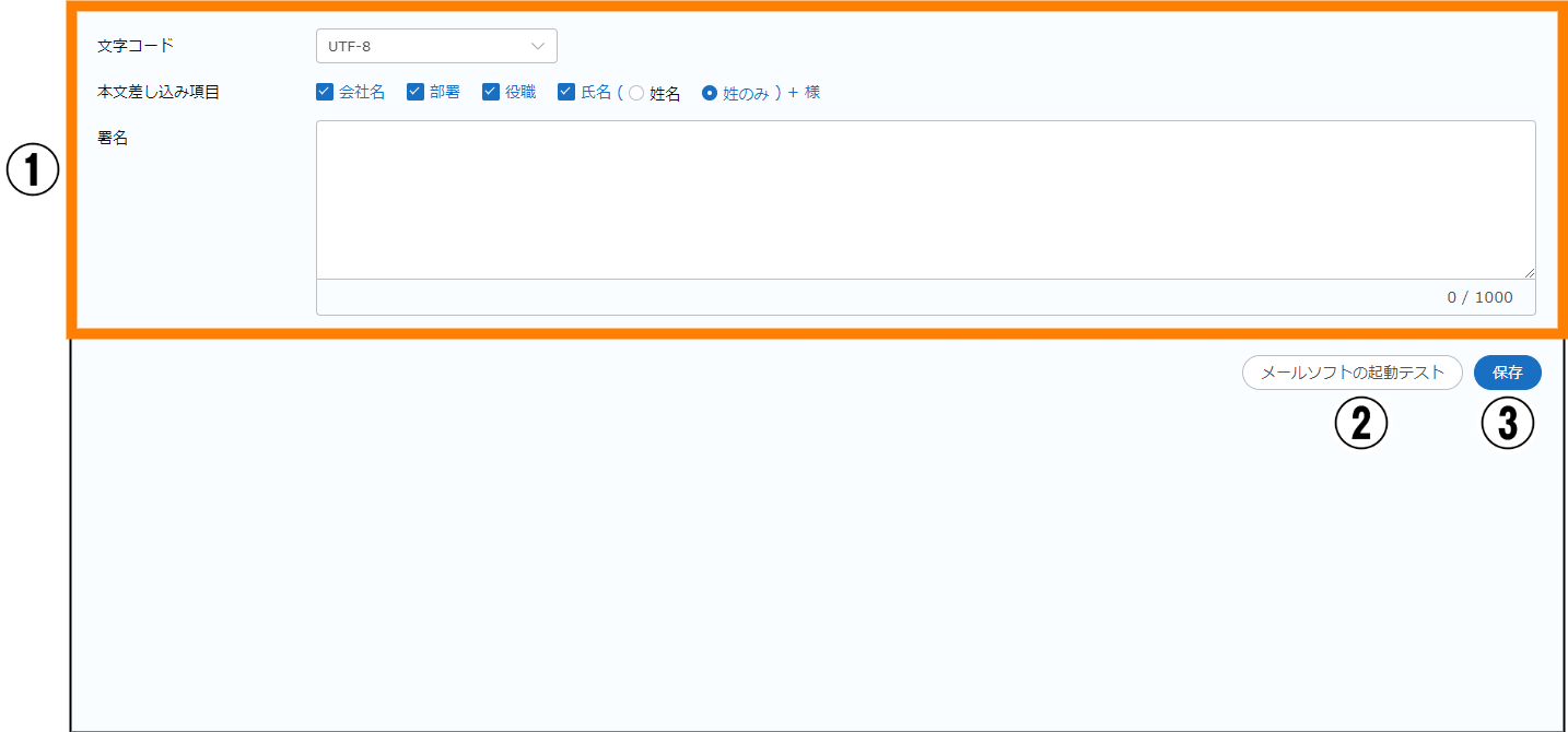 | ① | 文字コード | クリックすると表示されるリストから、メール送信時の文字コードが選択できます。選択できる文字コードは、「UTF-8」「Shift-JIS」「ISO-2022-JP」です。 | |