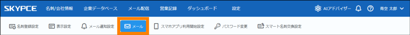 SKYPCEからメールを個別に送信する場合のメールの設定をします。本文に差し込む項目や署名などが設定できます。