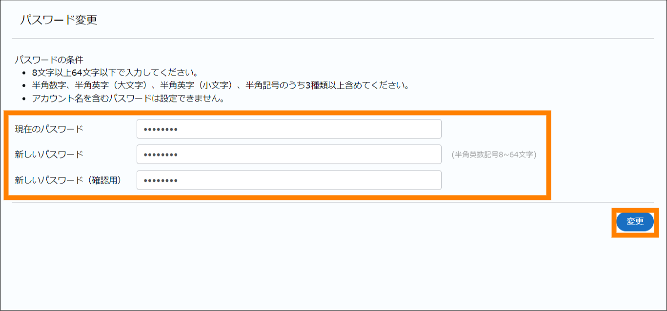 ③ 「現在のパスワード」を入力し、「新しいパスワード」と「新しいパスワード(確認用)」に任意のパスワードを入力し、[変更]をクリックする。