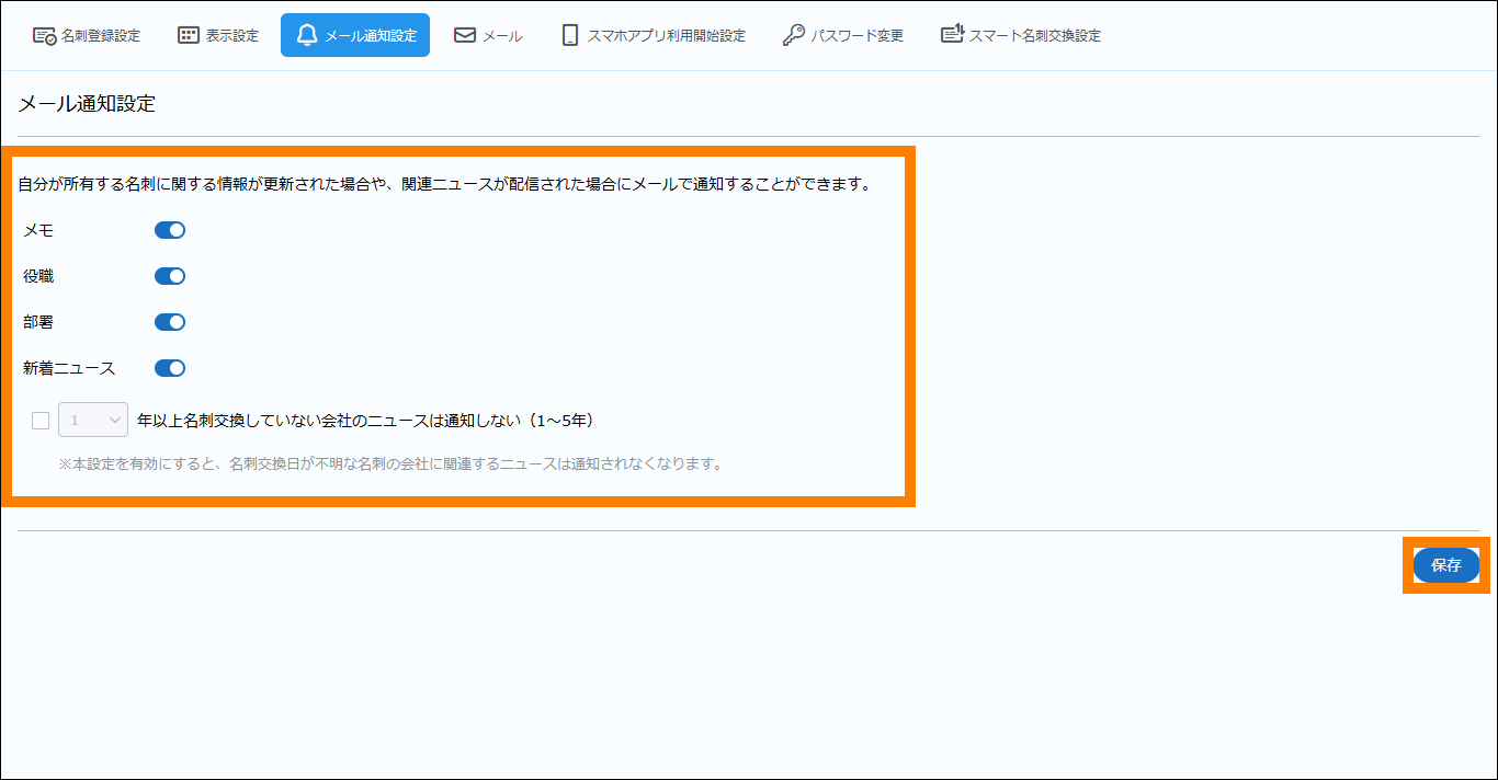 - 「●年以上名刺交換していない会社のニュースは通知しない(1~5年)」にチェックを入れた場合、名刺交換日が不明な名刺が登録されても、名刺交換していない年数は更新されません。そのため、指定の年数以上経過している名刺と名刺交換日が不明な名刺のみ所有している会社は、新着ニュースのメール通知の対象外となります。