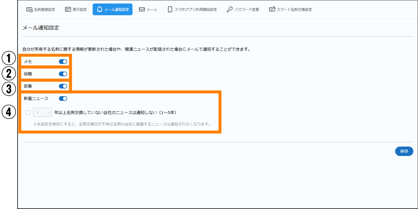 ③ 名刺登録に関する設定をし、[保存]をクリックする。