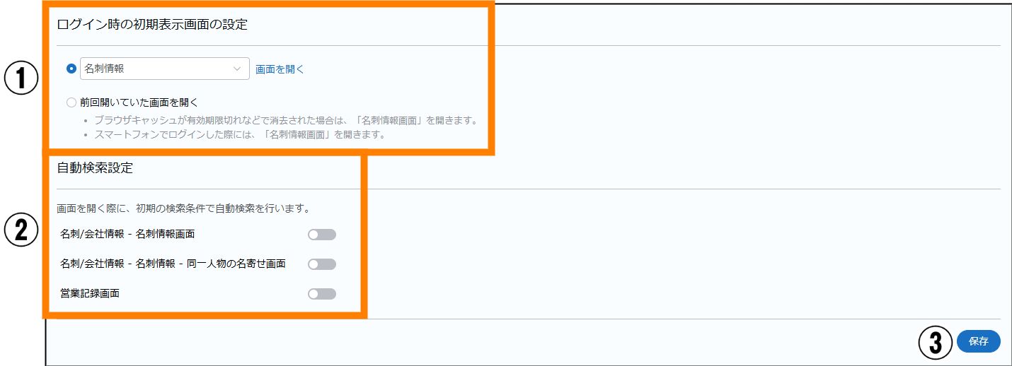 | ① | ログイン時の初期表示画面の設定 | 「SKYPCE(名刺管理)」へのログイン時に表示される画面の設定ができます。「画面指定」または、「前回開いていた画面を開く」のいずれかを選択してください。 | |