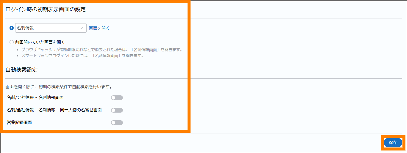画面表示に関する設定をします。「SKYPCE(名刺管理)」へのログイン時に表示される画面や自動検索(画面表示と同時に検索を行う)について設定できます。