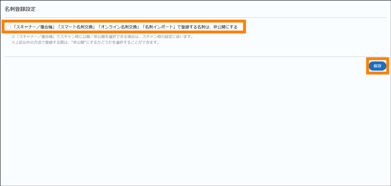 名刺登録に関する設定をします。登録時の名刺の非公開に関する設定ができます。