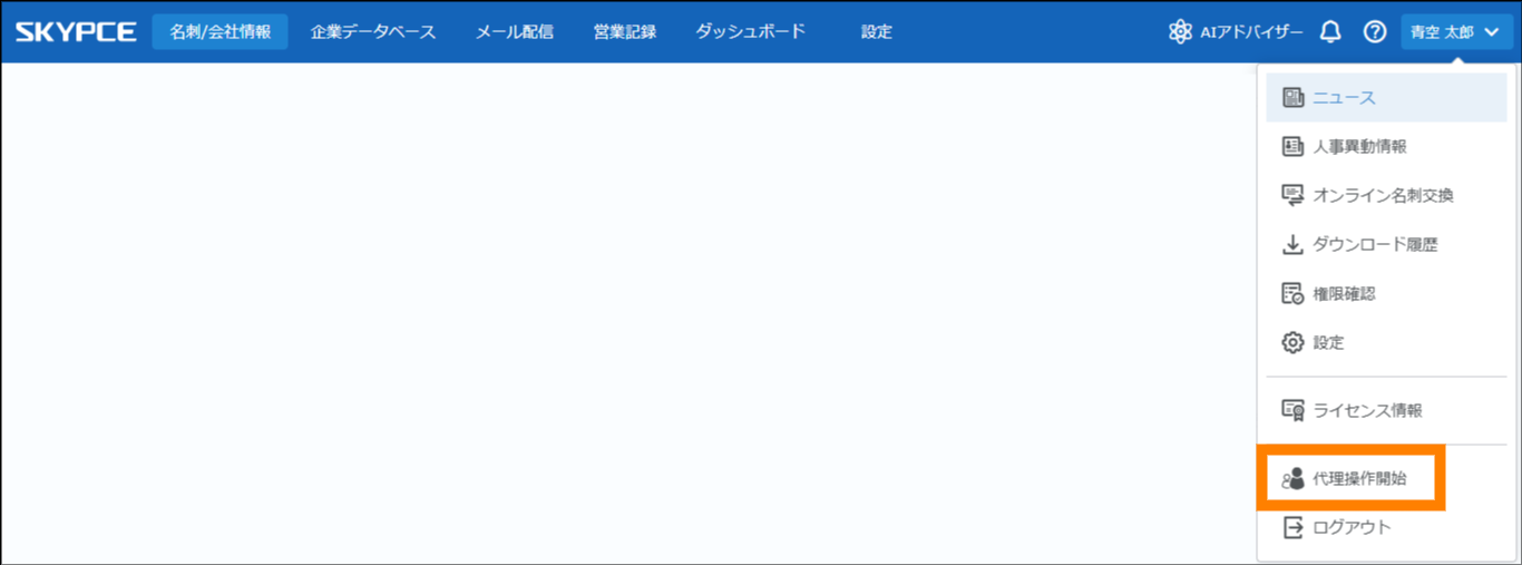① ログイン中のユーザー名をクリックし、「代理操作開始」をクリックする。