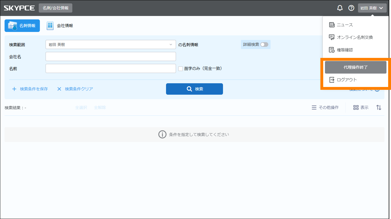 代理操作を終了する場合は、ログイン中のユーザー名をクリックし、「代理操作終了」または「ログアウト」をクリックしてください。