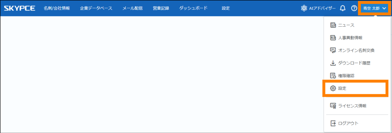 ① ログイン中のユーザー名をクリックし、「設定」をクリックする。