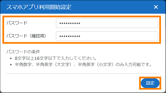 - パスワードは、8~16文字以内で設定できます。設定できる文字種は、「半角数字」「半角英字(大文字)」「半角英字(小文字)」です。