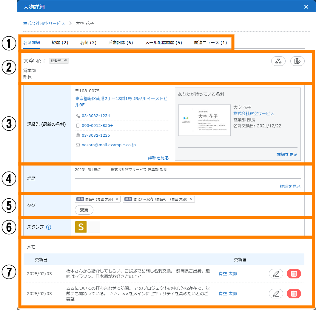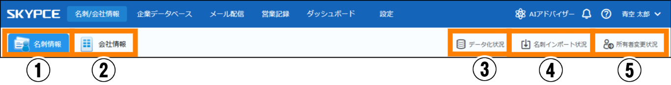 | ① | 名刺情報 | 名刺情報の登録や閲覧、タグの操作などができます。 | 参照 |