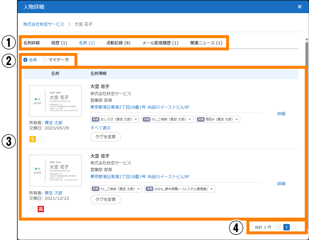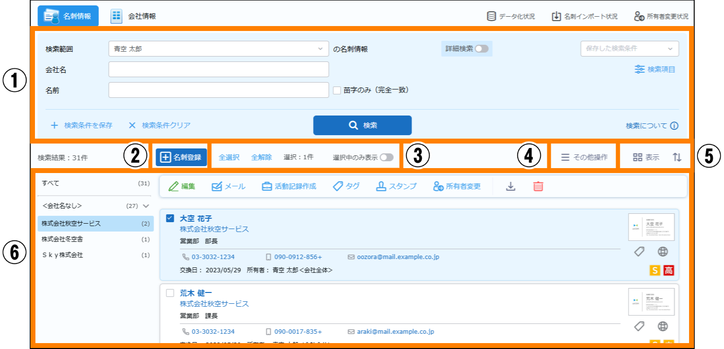| ① | 表示対象選択 | ④に表示する対象が選択できます。選択できる項目は、「自分の名刺」「会社全体の名刺」です。 |