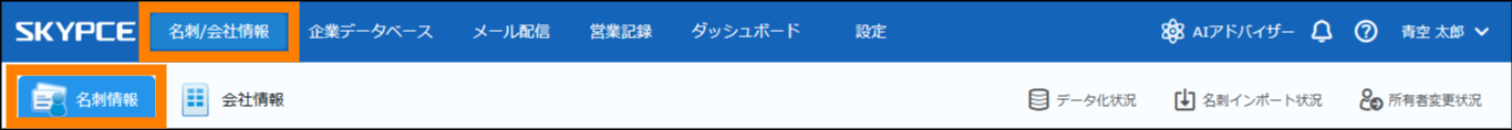 ① 「名刺 / 会社情報」をクリックし、「名刺情報」をクリックする。