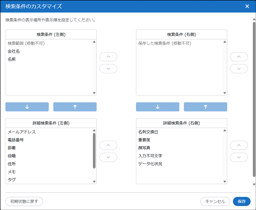 - 「検索項目」をクリックすると表示される「検索条件のカスタマイズ」画面で、検索や詳細検索に表示する項目が設定できます。