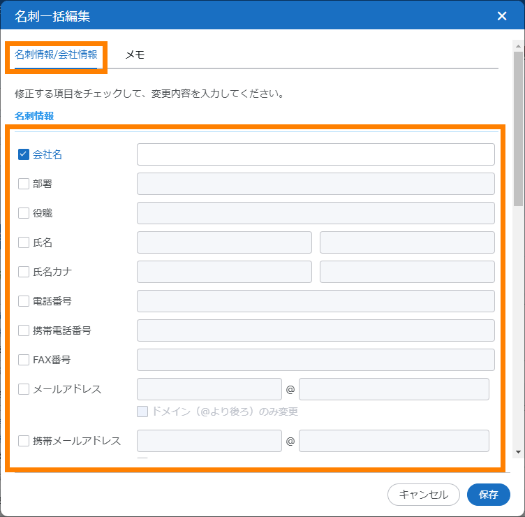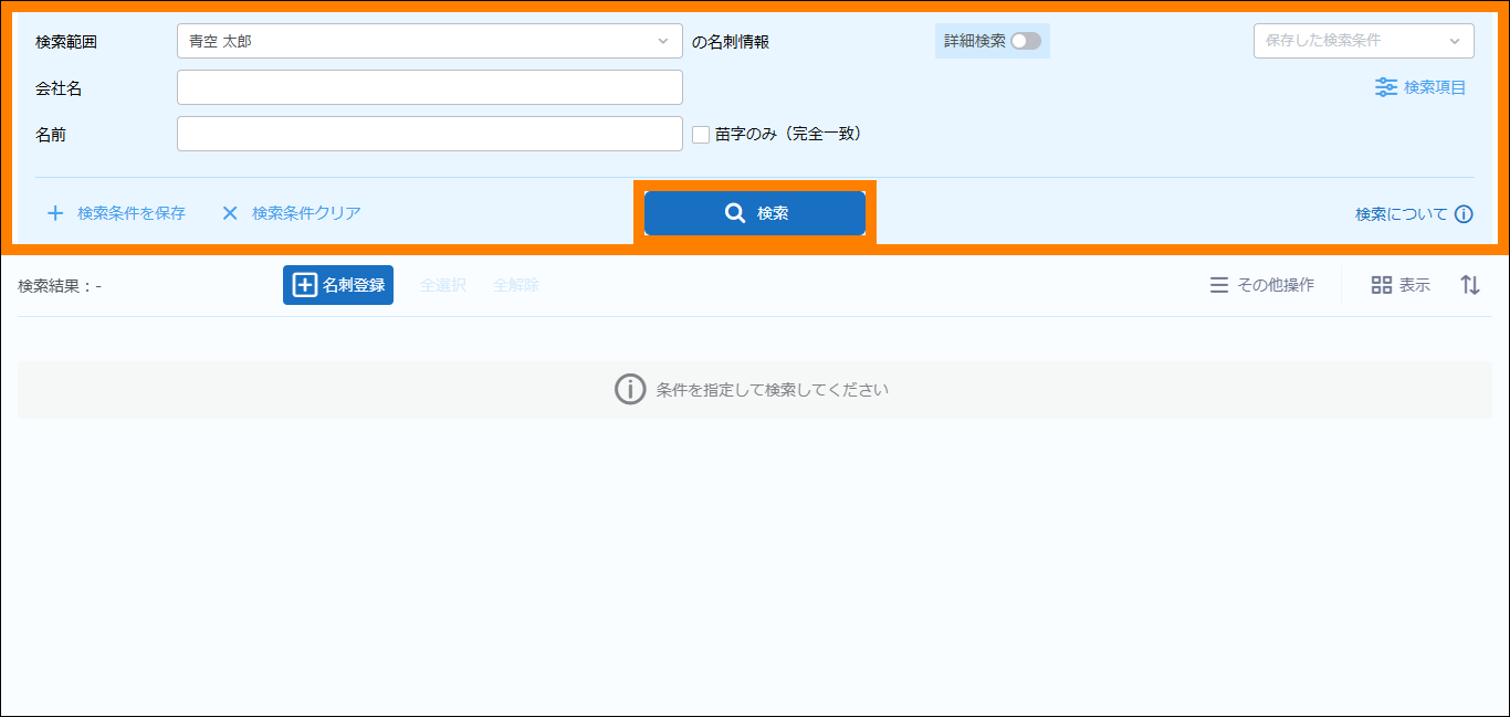 | 名前(※2) | 入力したキーワードと一致する名前で検索できます。追加条件として、「苗字のみ(完全一致)」にチェックを入れると、入力した内容と苗字が完全に一致する名刺情報が検索できます。 | ||