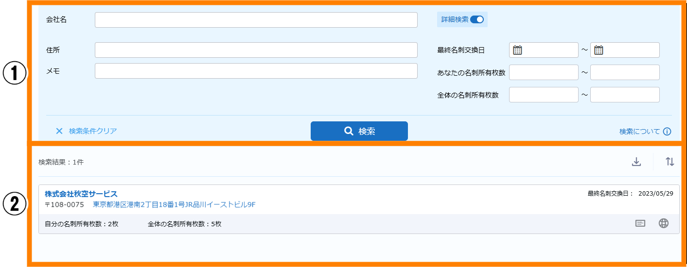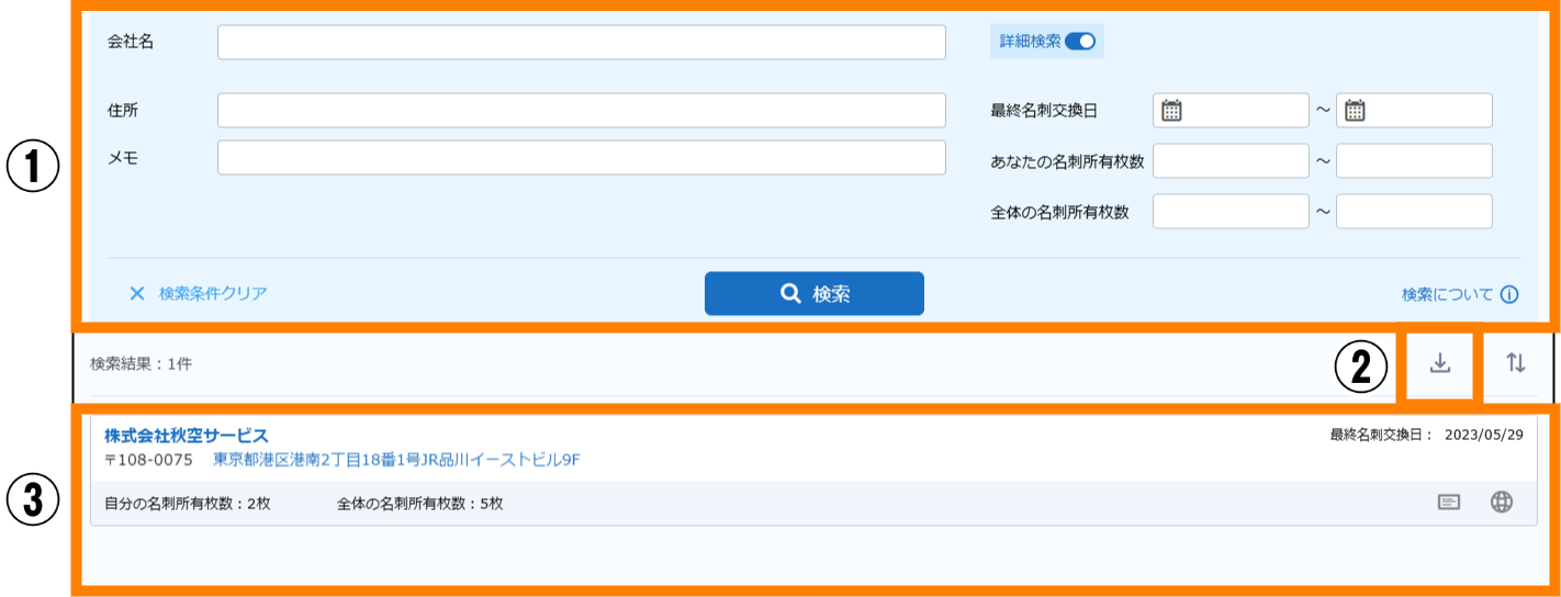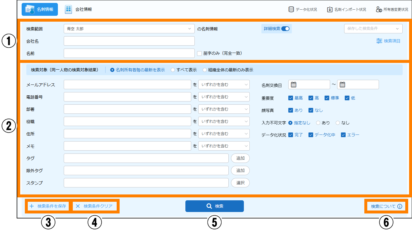 | ① | 検索 | 名刺情報の検索ができます。 | 参照 |