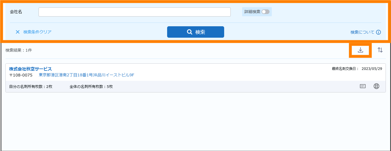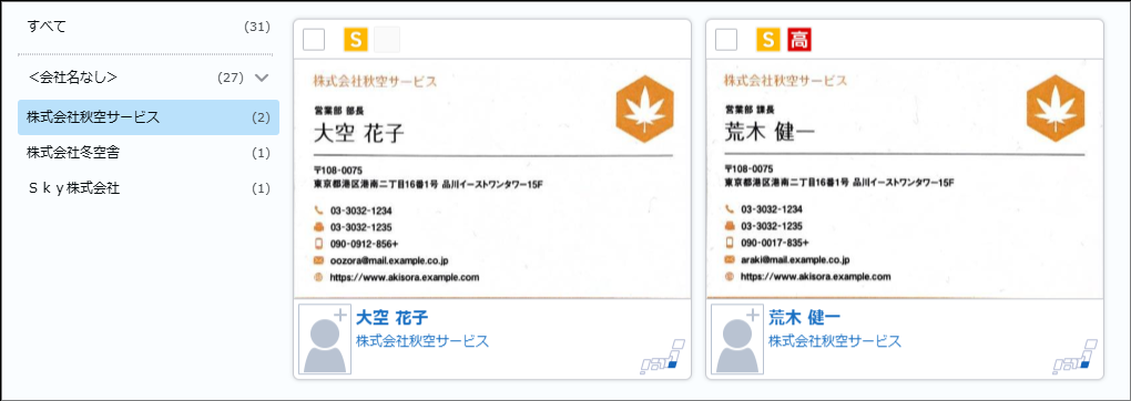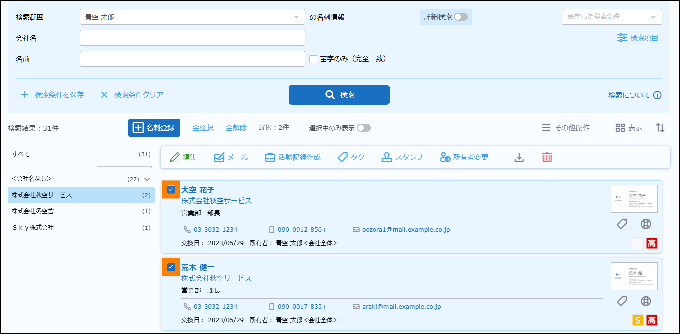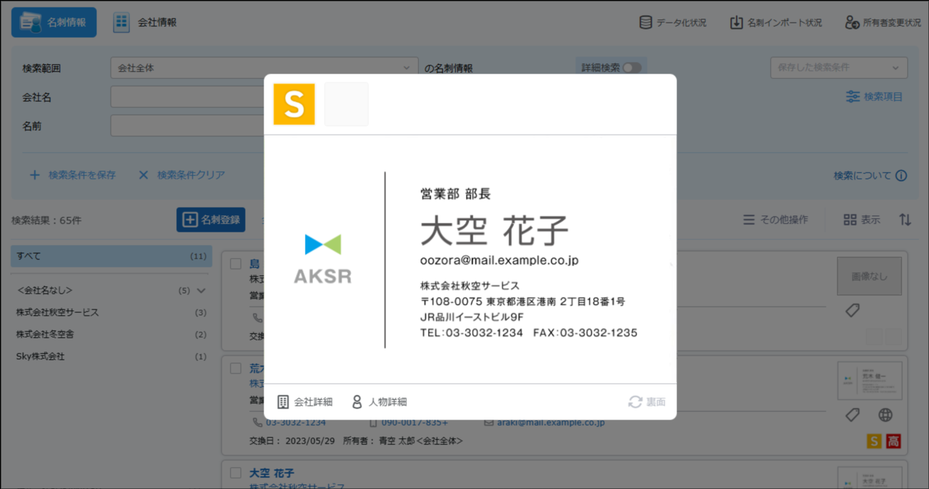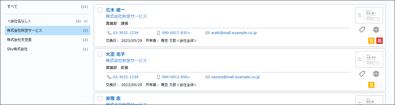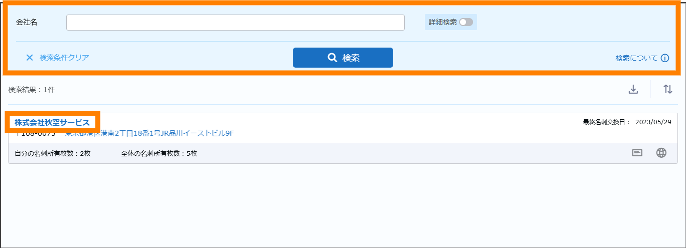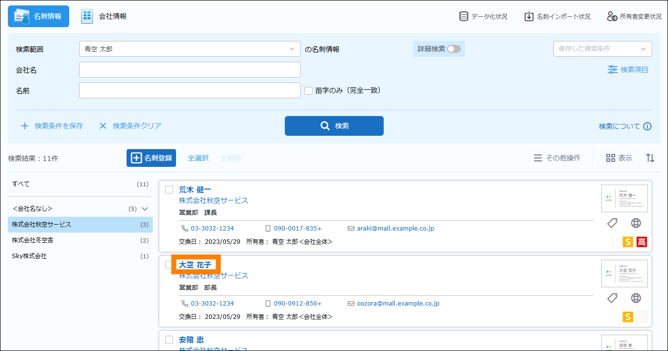 検索が実行され、名刺情報が表示されます。