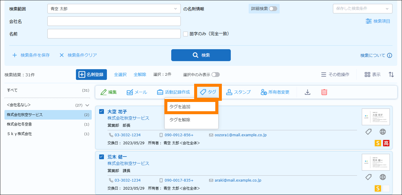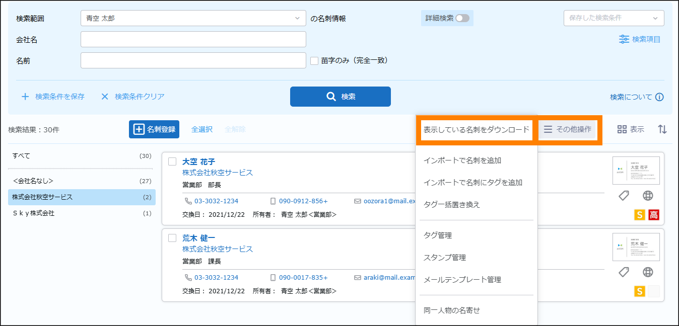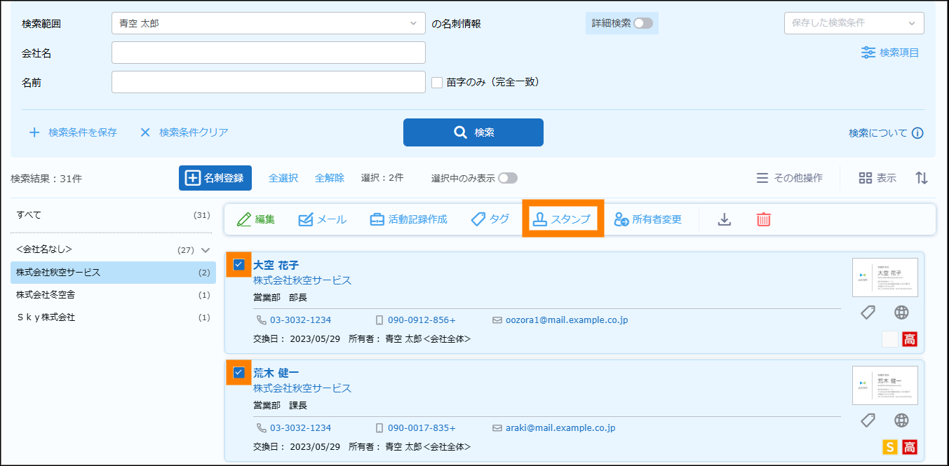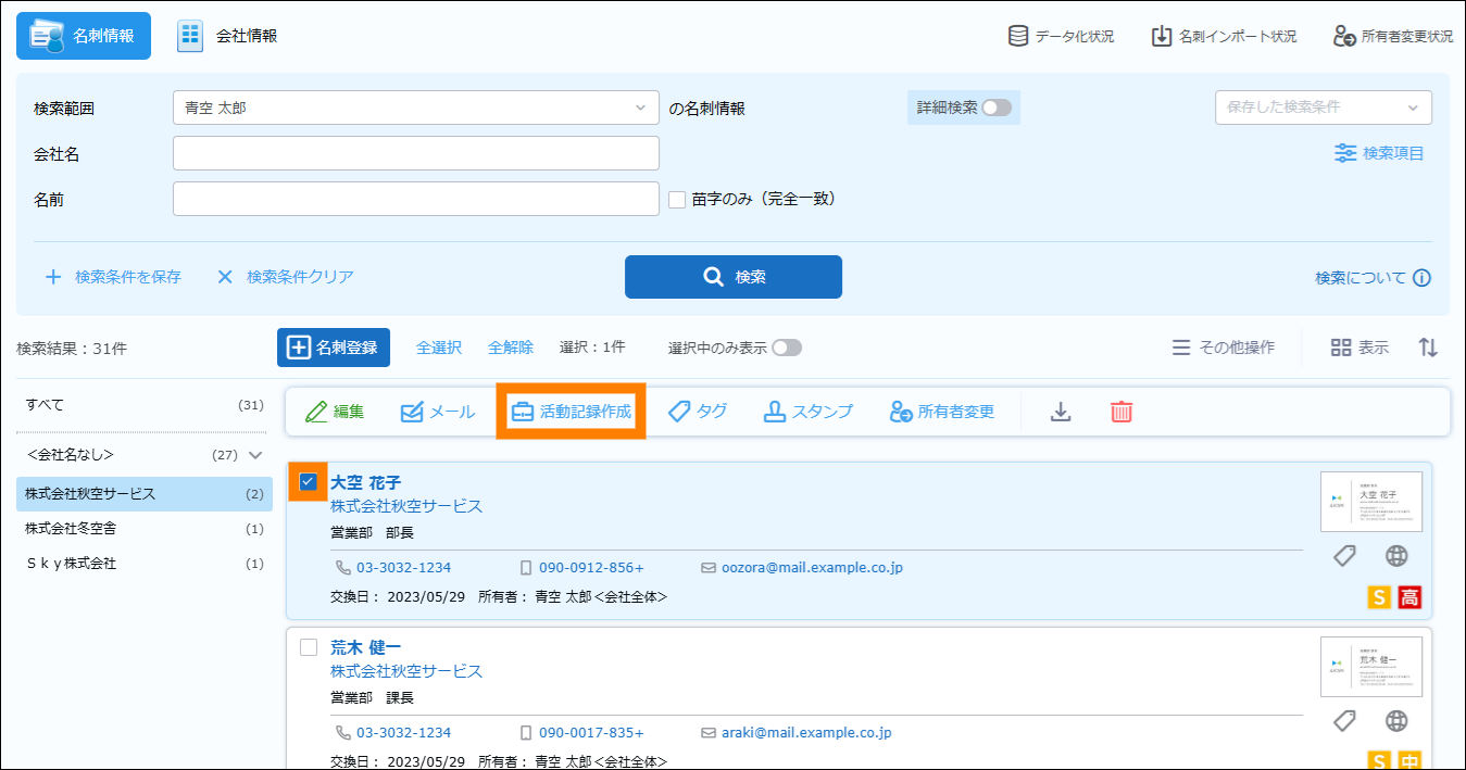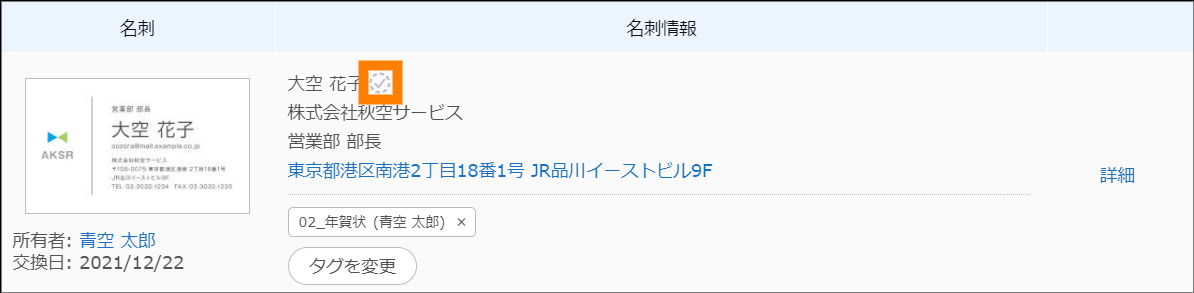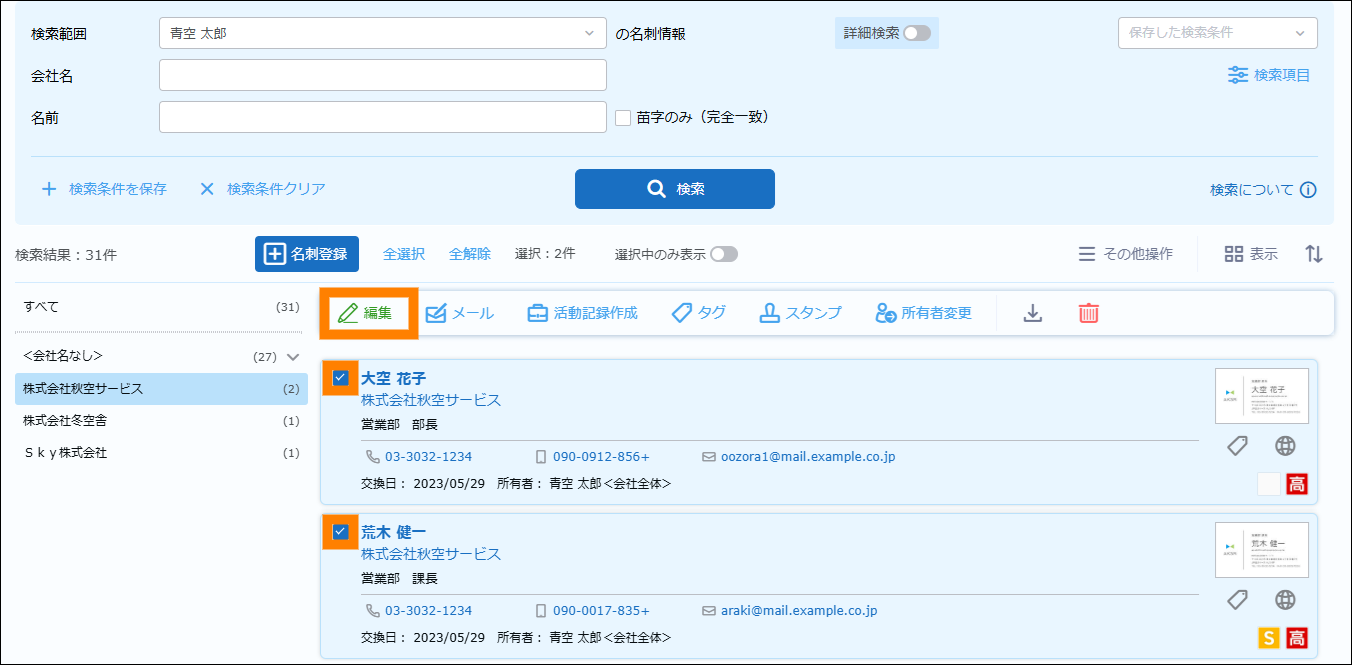検索が実行され、名刺情報が表示されます。