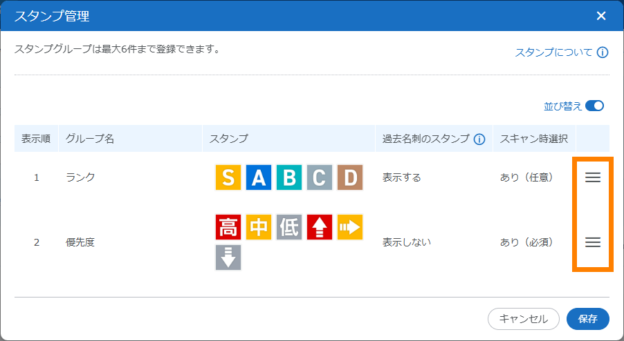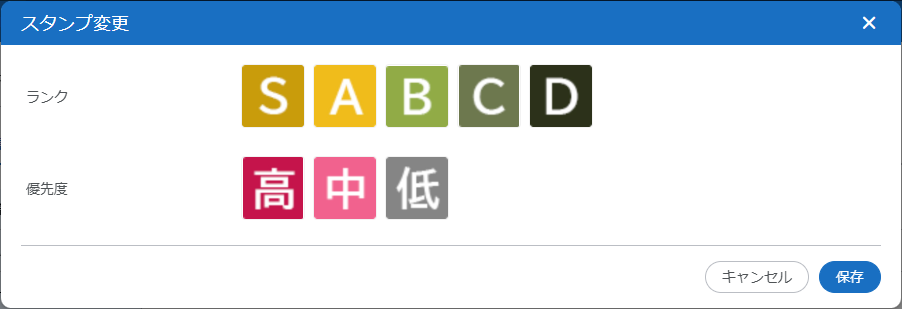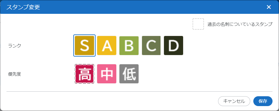 またはスタンプが表示されます。クリックすると、スタンプグループごとに登録されているスタンプが表示されます。現在選択されているスタンプには青色の枠が表示されます。スタンプを変更する場合は、変更するスタンプをクリックして[保存]をクリックしてください。なお、最新の名刺情報にスタンプが登録されていない場合に、過去の名刺情報のスタンプを表示させているときは、灰色の破線が表示されます。