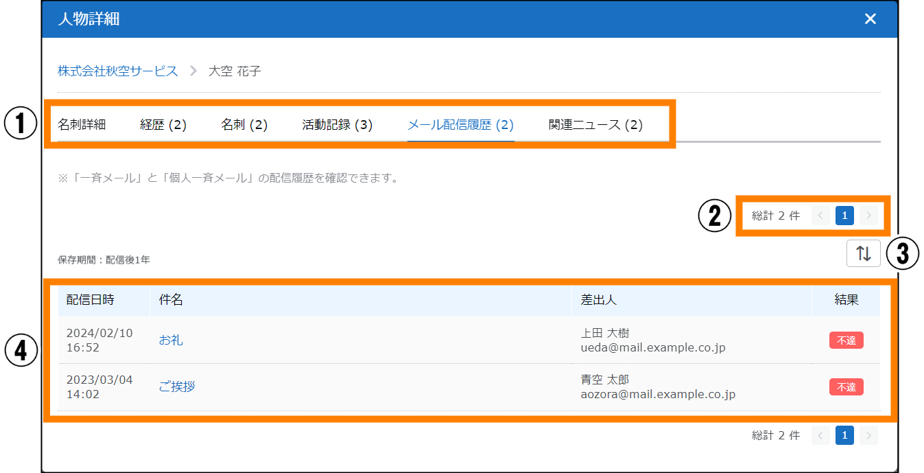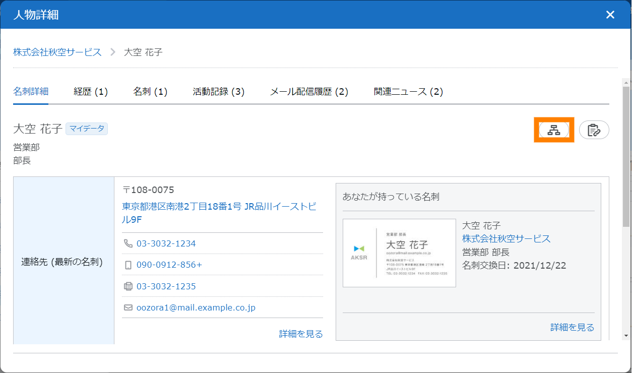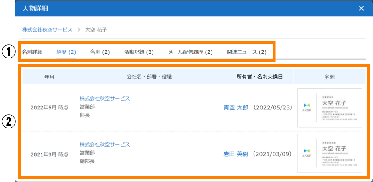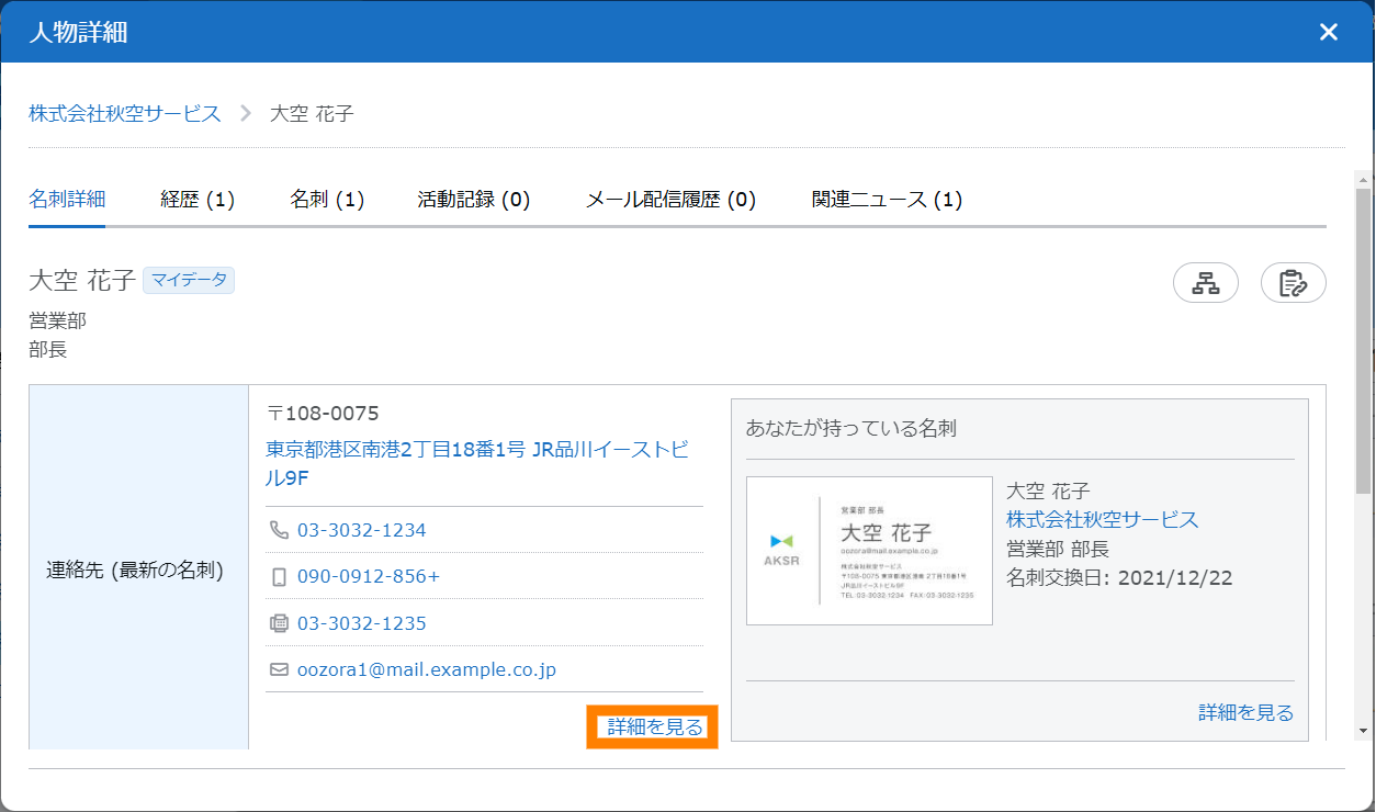 - 「氏名」をクリックすると、「人物詳細」で「名刺詳細」を選択した場合の画面が表示されます。詳しくは、「■「人物詳細」画面について」を参照してください。