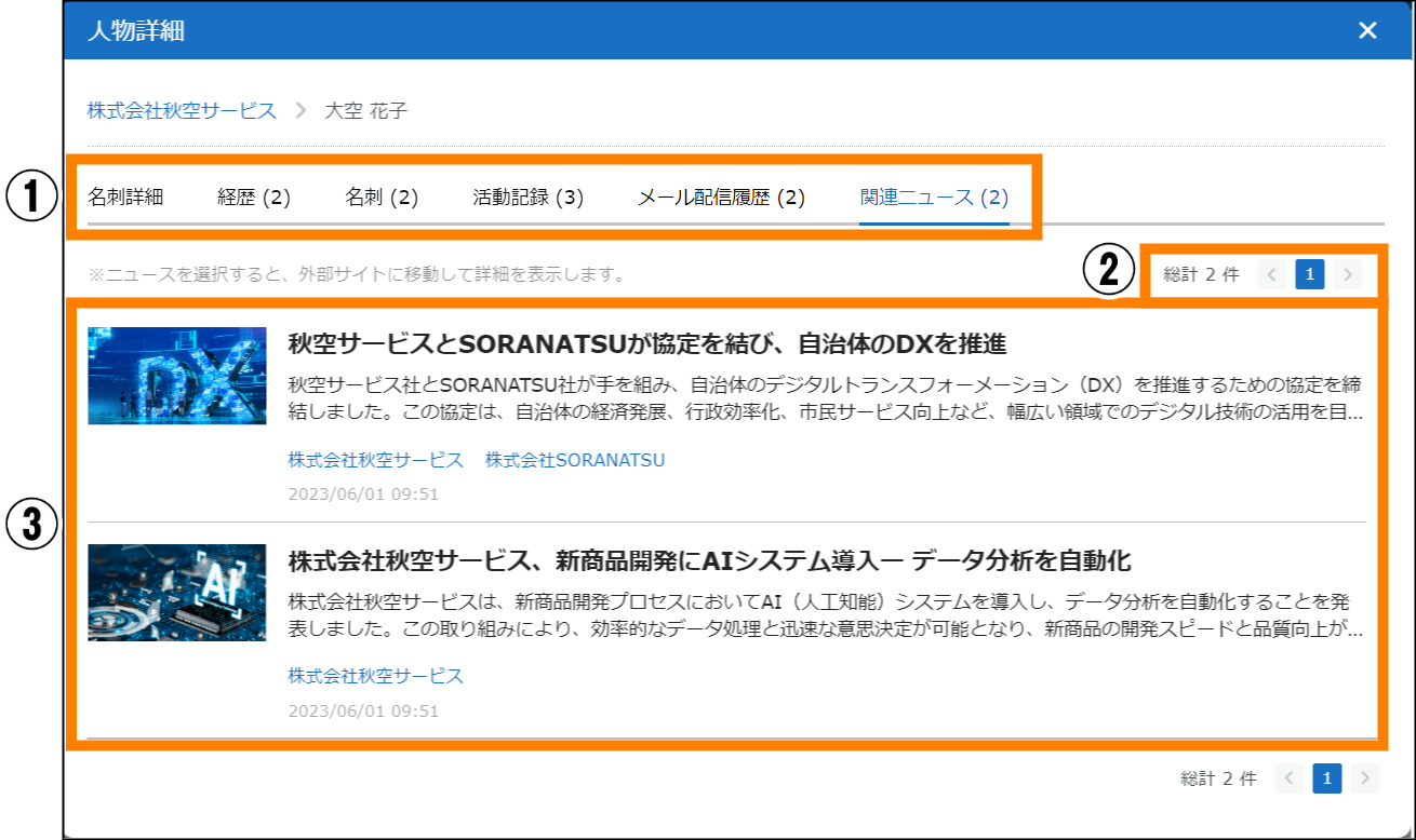 - オプションの「新聞人事異動情報」を導入している場合に表示されます。また、対象企業の人事異動情報がある場合に表示されます。そのため、対象の企業によっては表示されない場合があります。