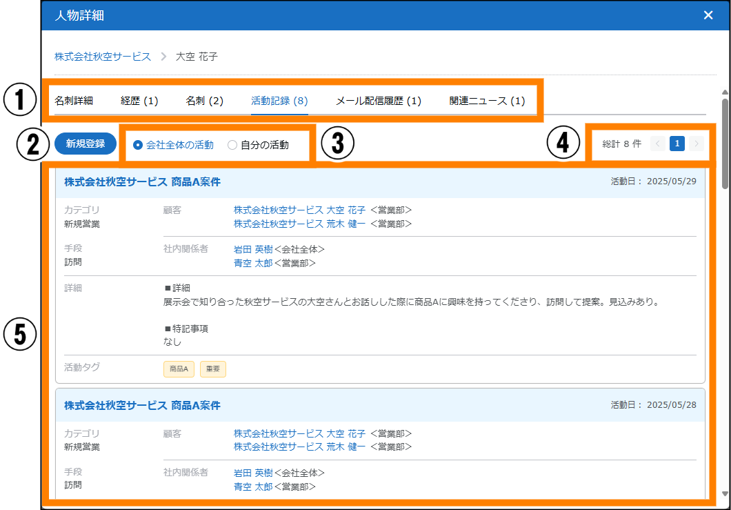 | 名刺 | クリックすると、会社情報と紐づいた名刺情報が確認できます。名刺情報の[詳細]をクリックすると、「人物詳細」画面が表示されます。詳しくは、「■「人物詳細」画面について」を参照してください。 | ||