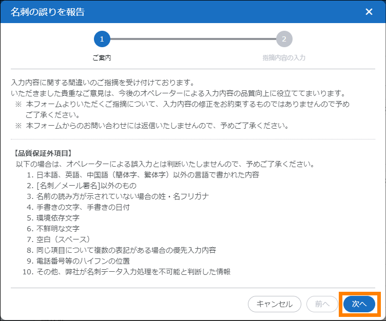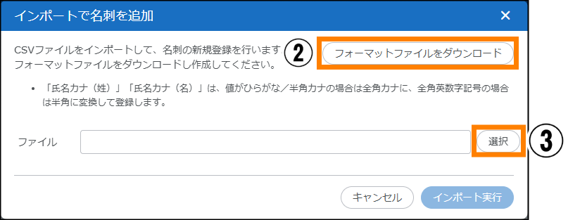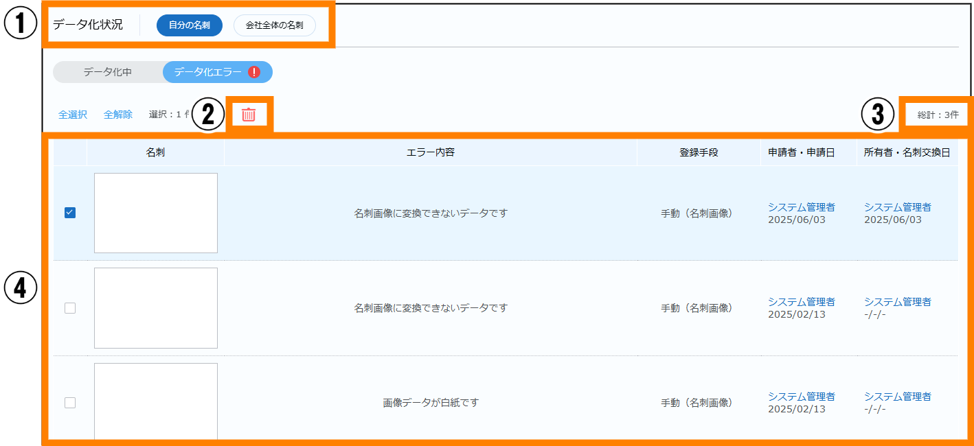 | ② | クリックすると、④で選択したエラーの発生した名刺データが削除されます。 | |