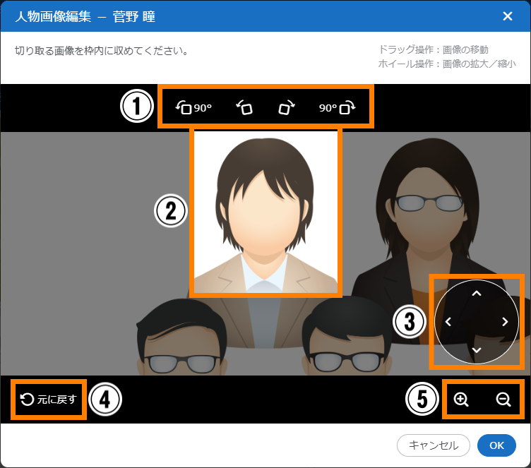 をクリックすると、「人物画像編集」画面が表示され、人物の画像が登録できます。 [ファイル選択]をクリックし、登録する画像を選択してください。必要に応じて画像を切り取り、[登録]をクリックしてください。なお、「人物画像編集」画面で画像を切り取る方法については、「■「人物画像編集」画面での画像の切り取りについて」を参照してください。登録できる画像は、Webブラウザーがサポートしている画像フォーマットのものです。画像を使用する場合は、「人物画像編集」画面の「注意事項」を必ず確認してください。 - 名刺の画像が登録されている場合、クリックすると、名刺の画像が拡大されます。