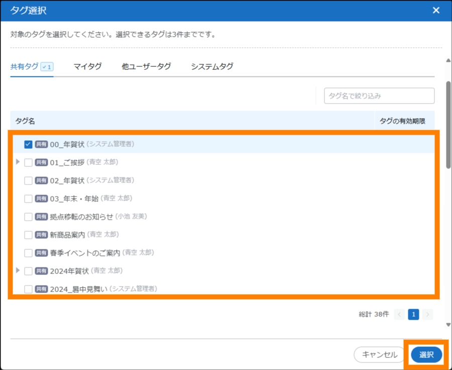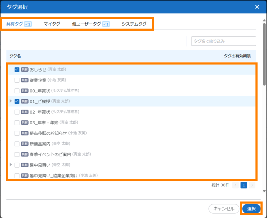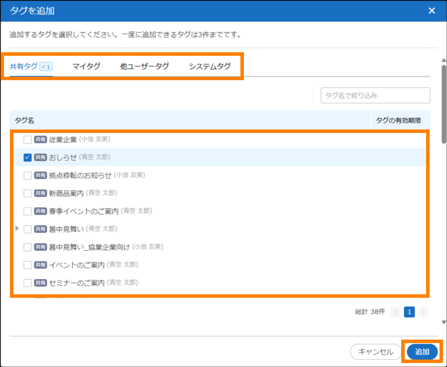 | タグ選択項目 | 名刺情報のタグを検索の条件に追加できます。対象となる項目は、「タグ」「除外タグ」です。[追加]をクリックすると表示される画面で、対象のタグにチェックを入れ、[選択]をクリックしてください。なお、「除外タグ」に追加されたタグが付与されている名刺情報は、検索結果から除外されます。 | ||