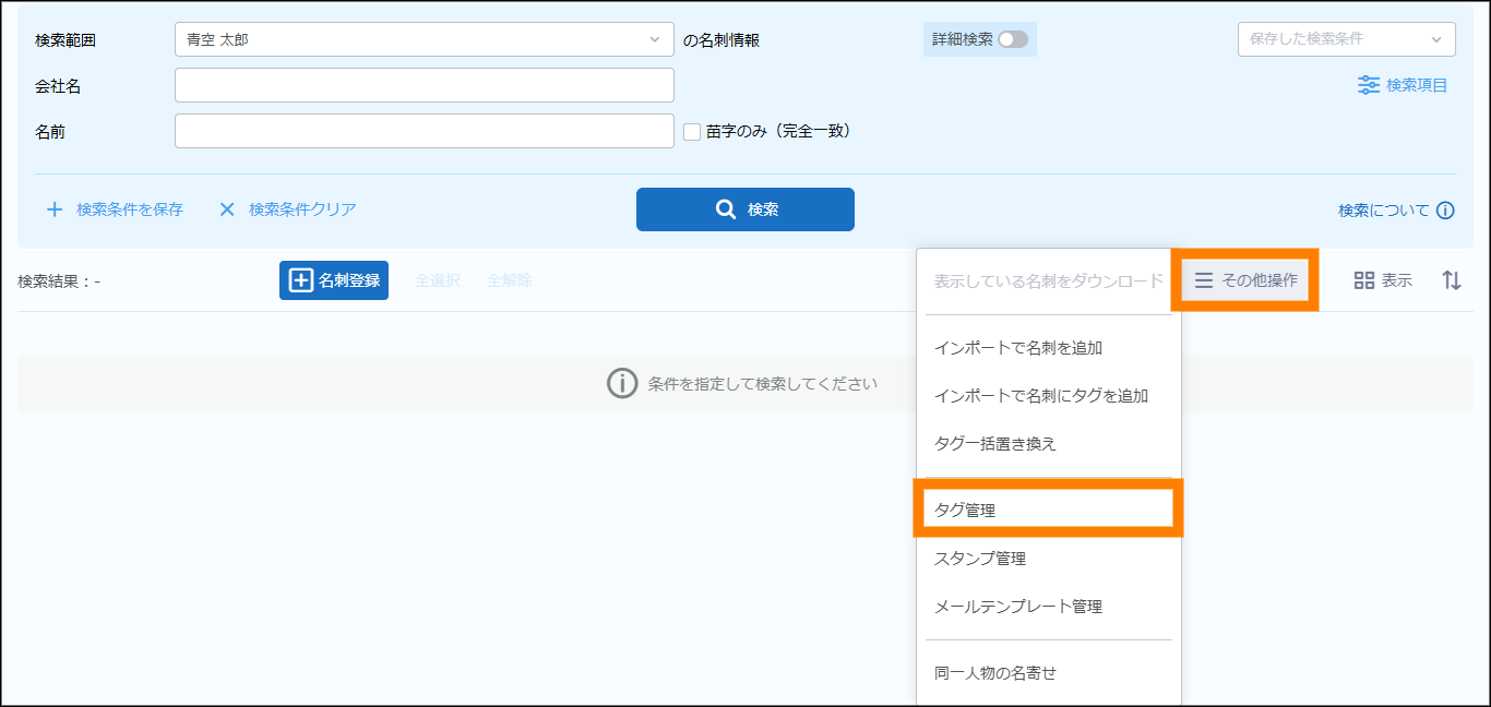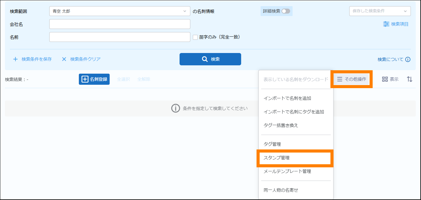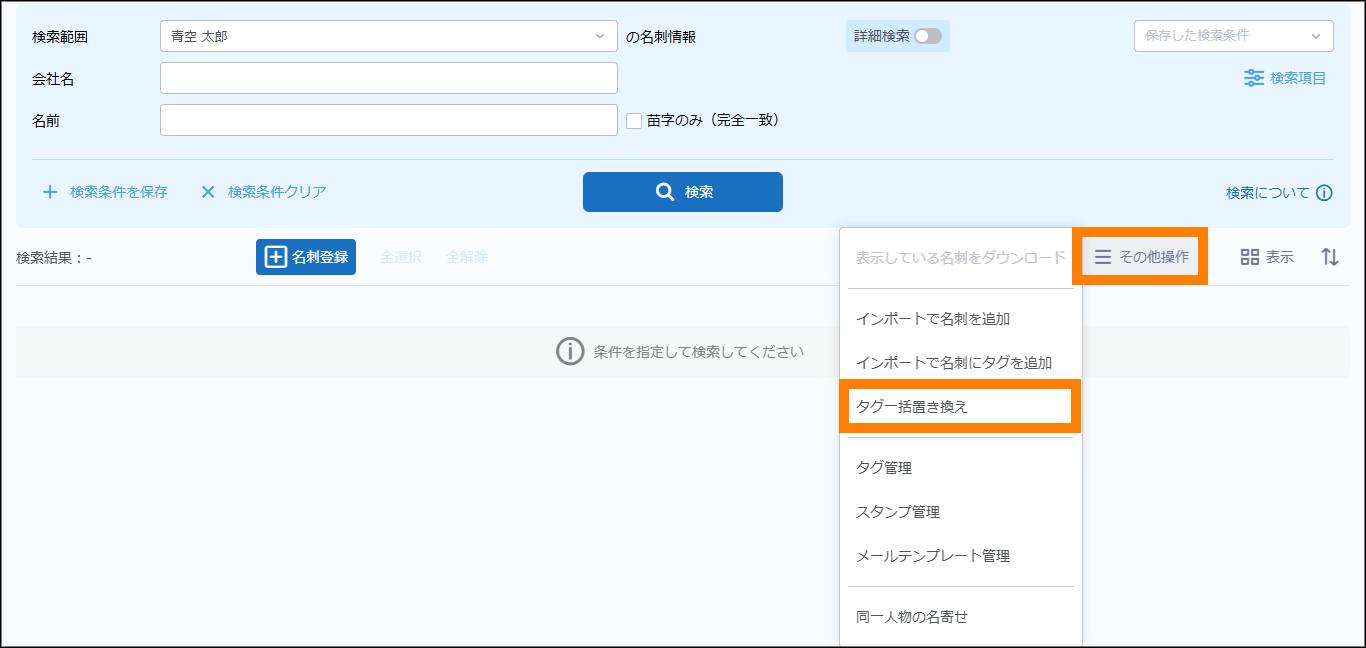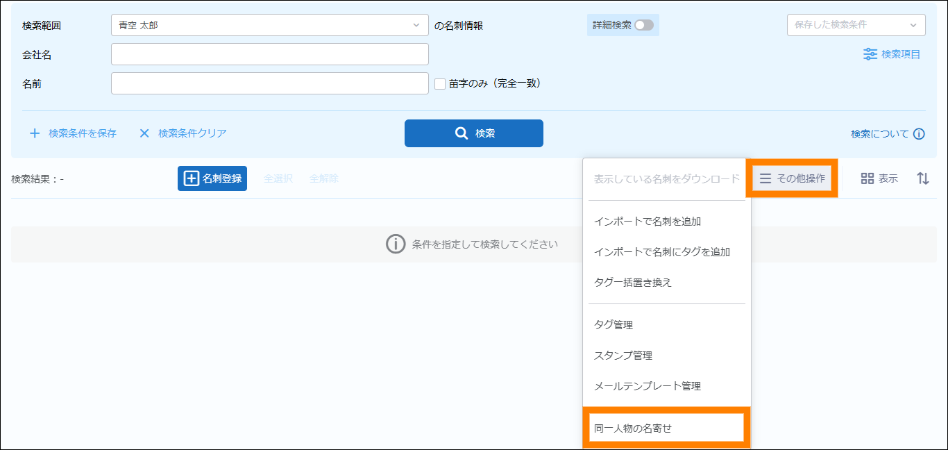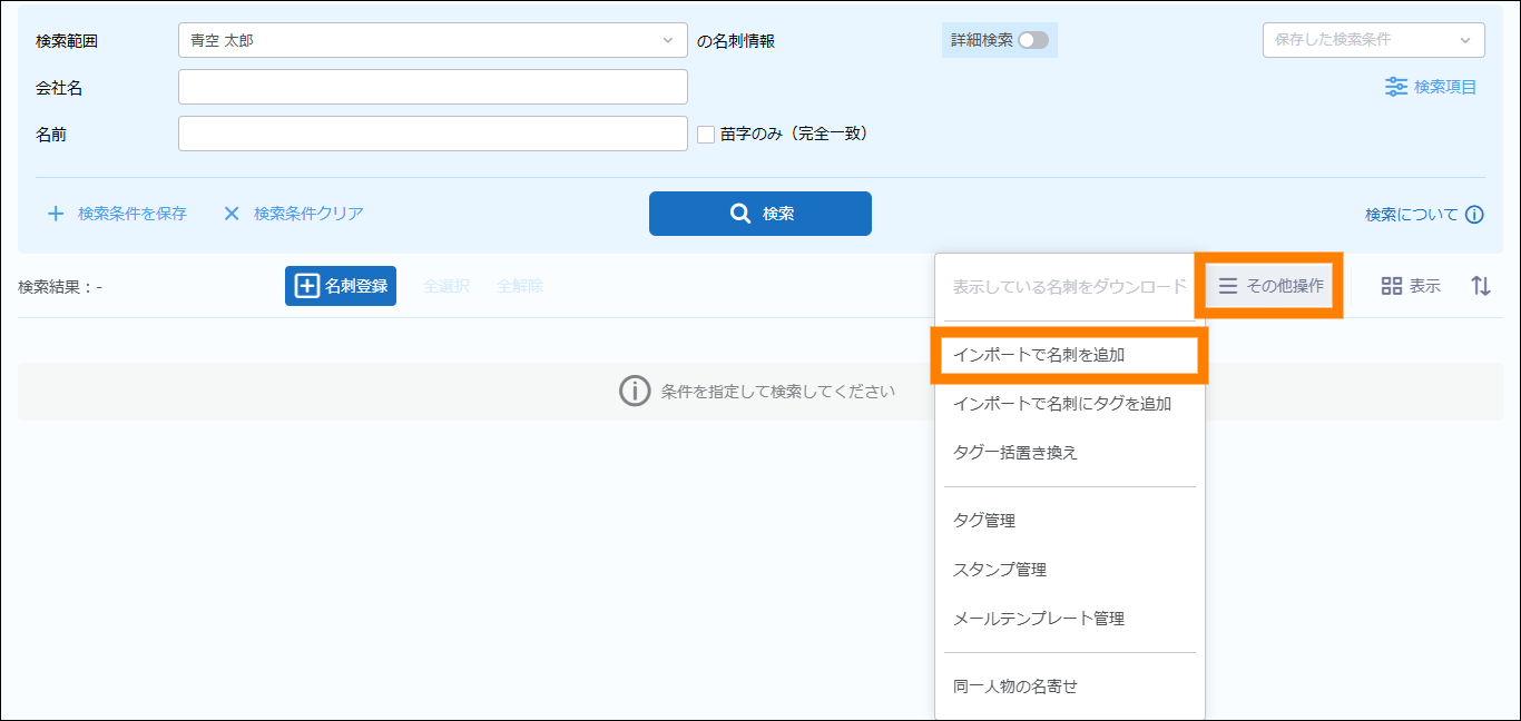| 名刺交換日 | 名刺の交換日を検索の条件に追加できます。日付(期間)で指定してください。 | ||