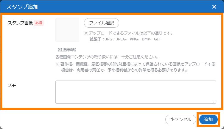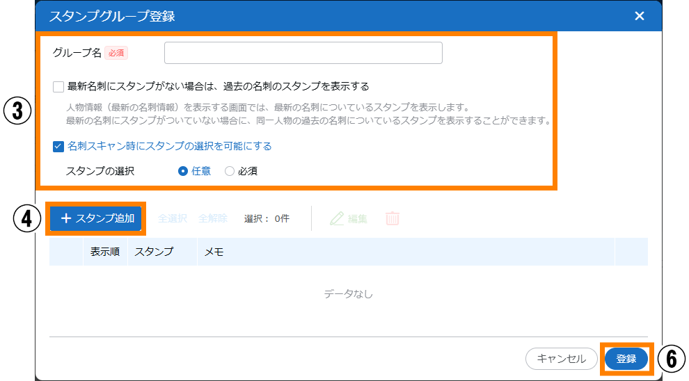 | スタンプ | 名刺を選択してスタンプを追加できます。 | 参照 | |