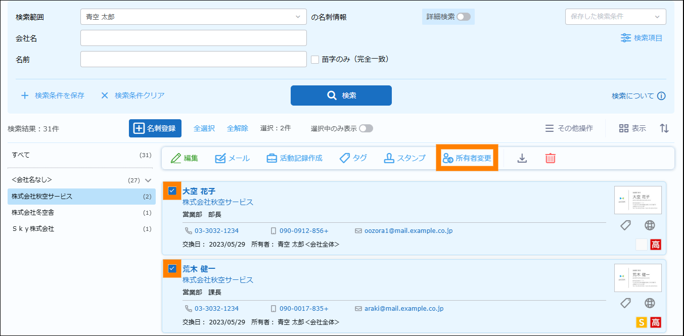 | 所有者変更 | 名刺の所有者が変更できます。 | 参照 | |