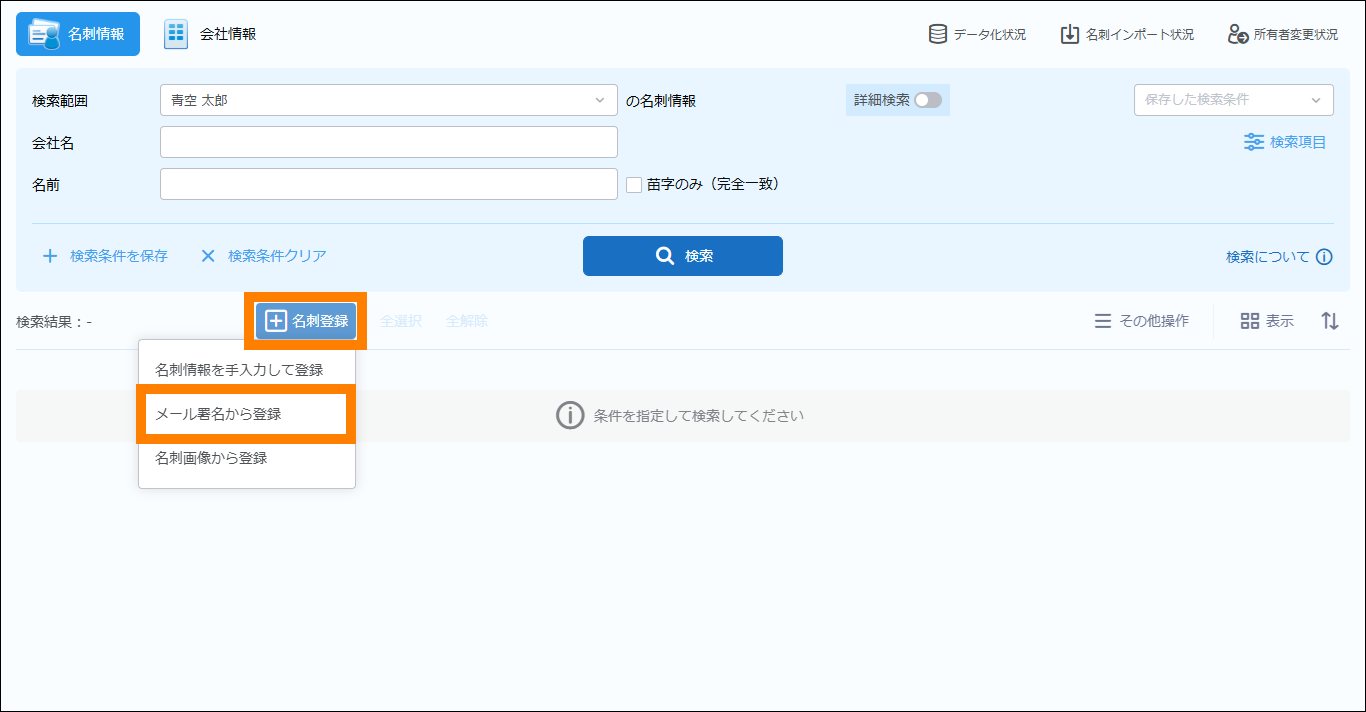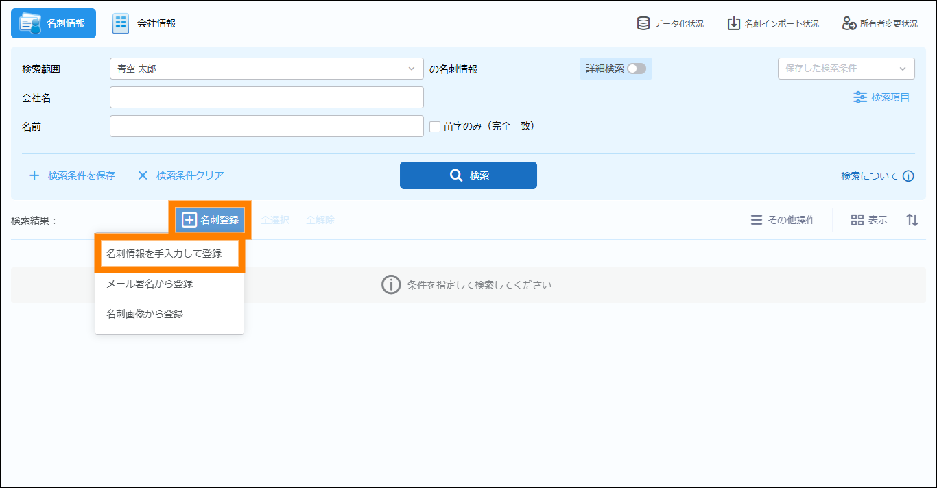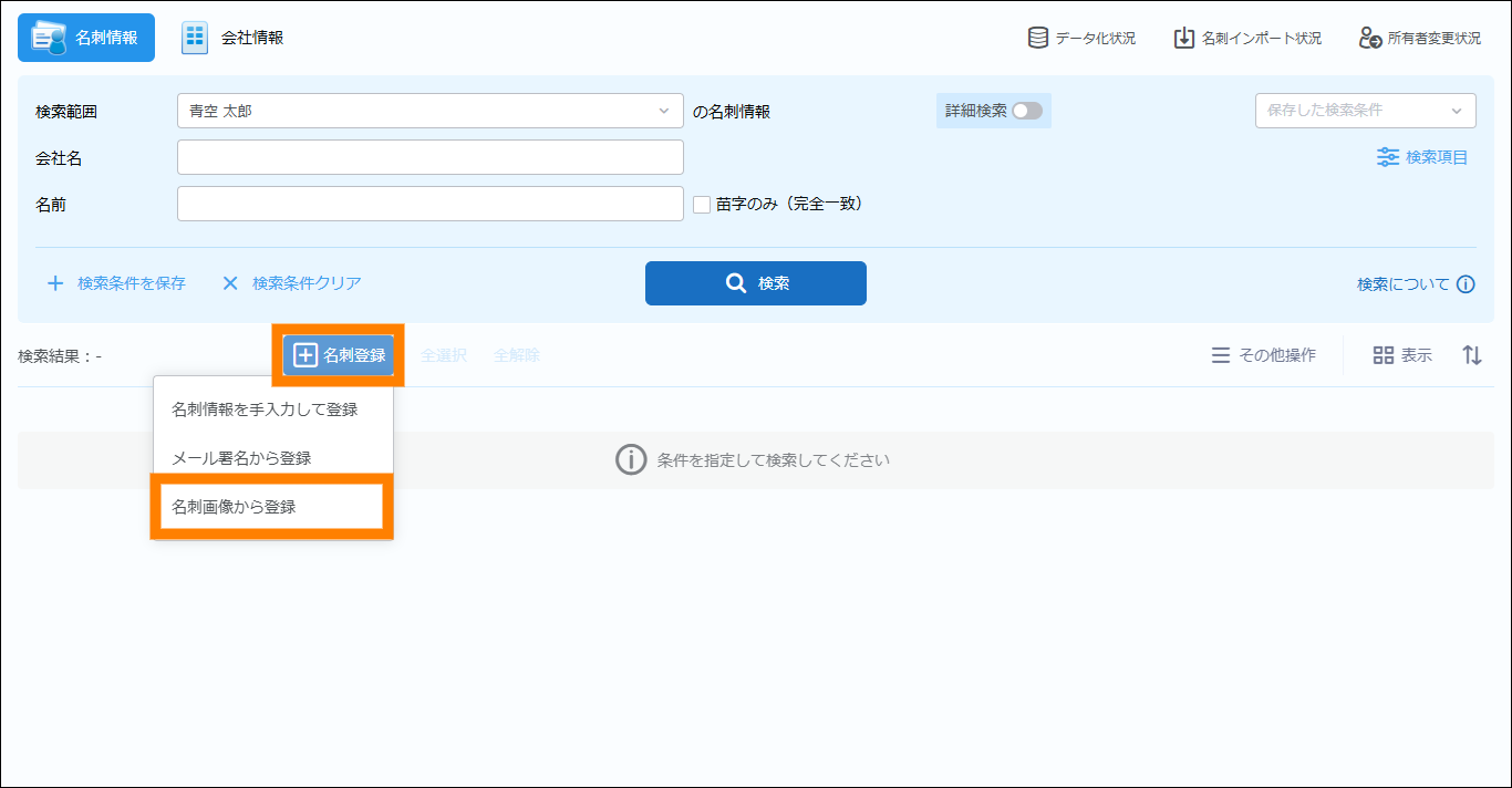 | 名刺所有者 | クリックすると、「ユーザー / 部署選択」画面が表示され、検索の対象となる範囲が選択できます。 | |
