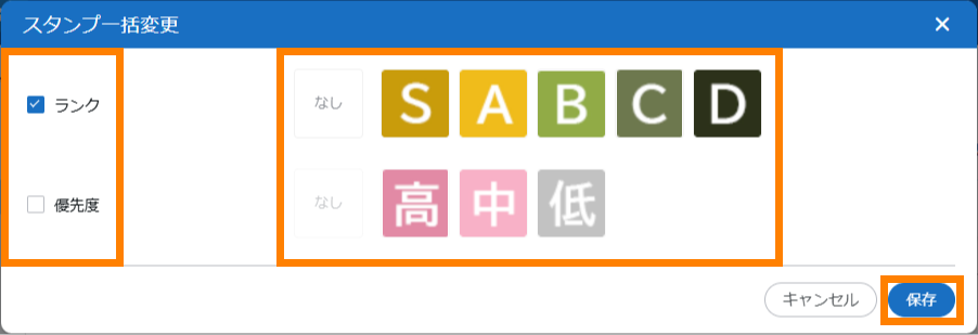 | スタンプ選択項目 | 名刺情報のスタンプを検索の条件に追加できます。[選択]をクリックすると表示される画面で、対象のスタンプを選択し、[OK]をクリックしてください。 | ||