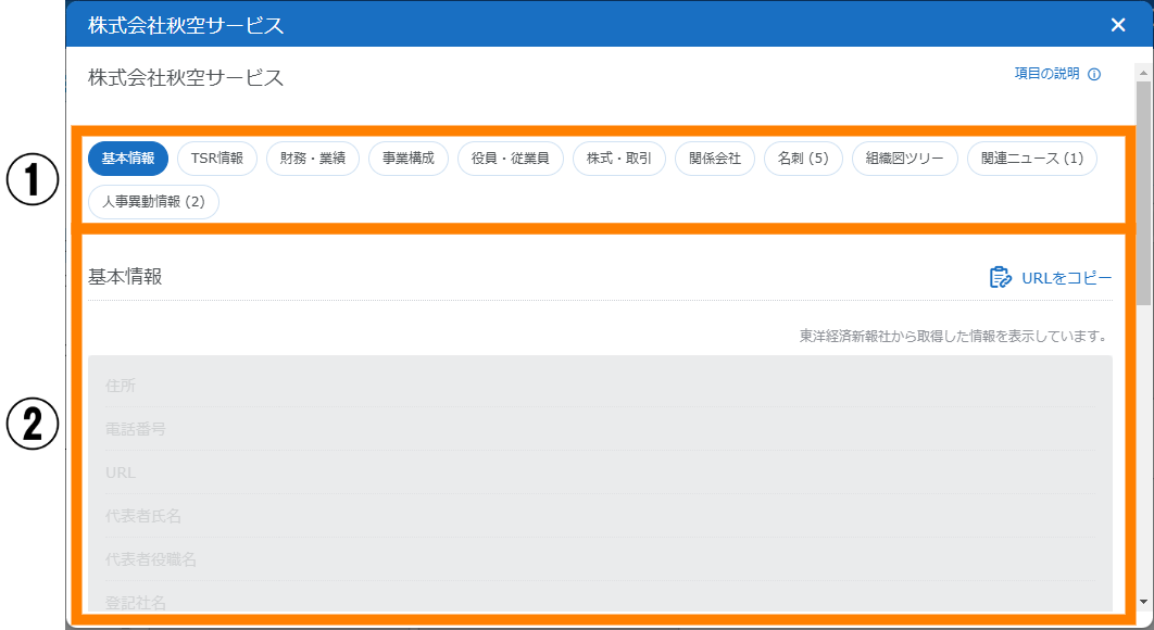 | 基本情報(※1) | クリックすると、住所や電話番号など会社の基本情報が表示されます。 | ||