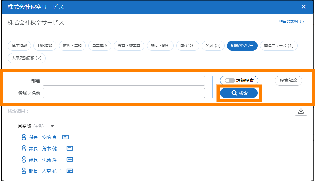 | 部署 | 入力したキーワードと一致する部署で検索できます。 | |