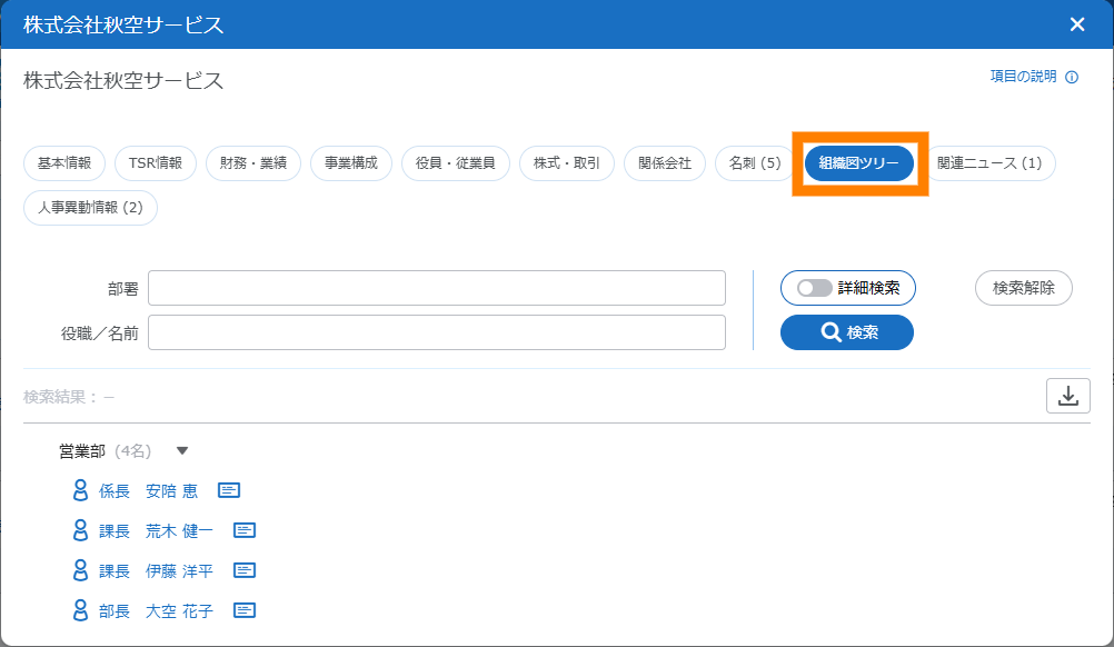 - 役員に関する情報は、対象企業の役員情報がある場合に表示されます。従業員に関する情報は、企業データベースに対象企業の情報がある場合に表示されます。そのため、対象の企業によっては表示されない場合があります。