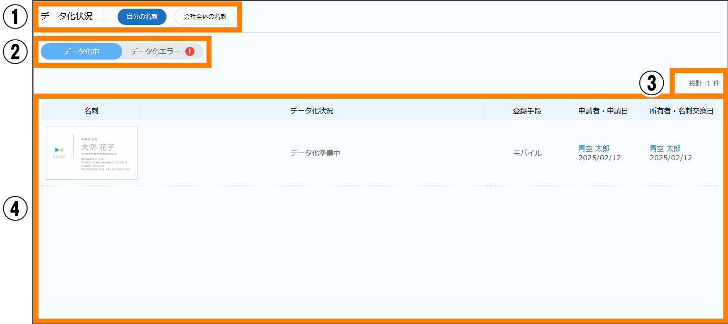 | ④ | データ化状況 | 名刺のデータ化状況が表示されます。 | ― |