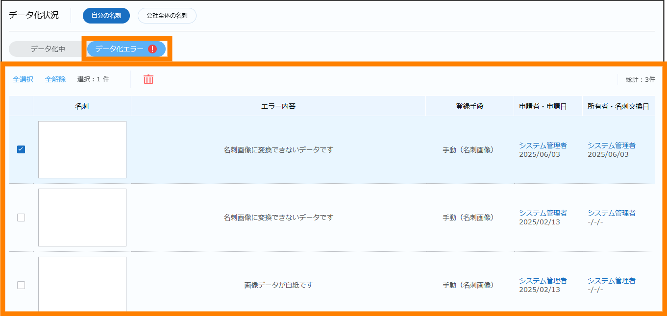をクリックしてください。なお、複数のデータにチェックを入れると、まとめて削除できます。 - [全選択]をクリックすると、ページ内に表示されているエラーの発生したすべてのデータにチェックが入ります。
