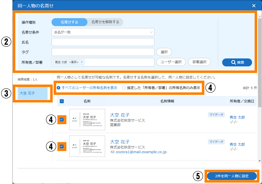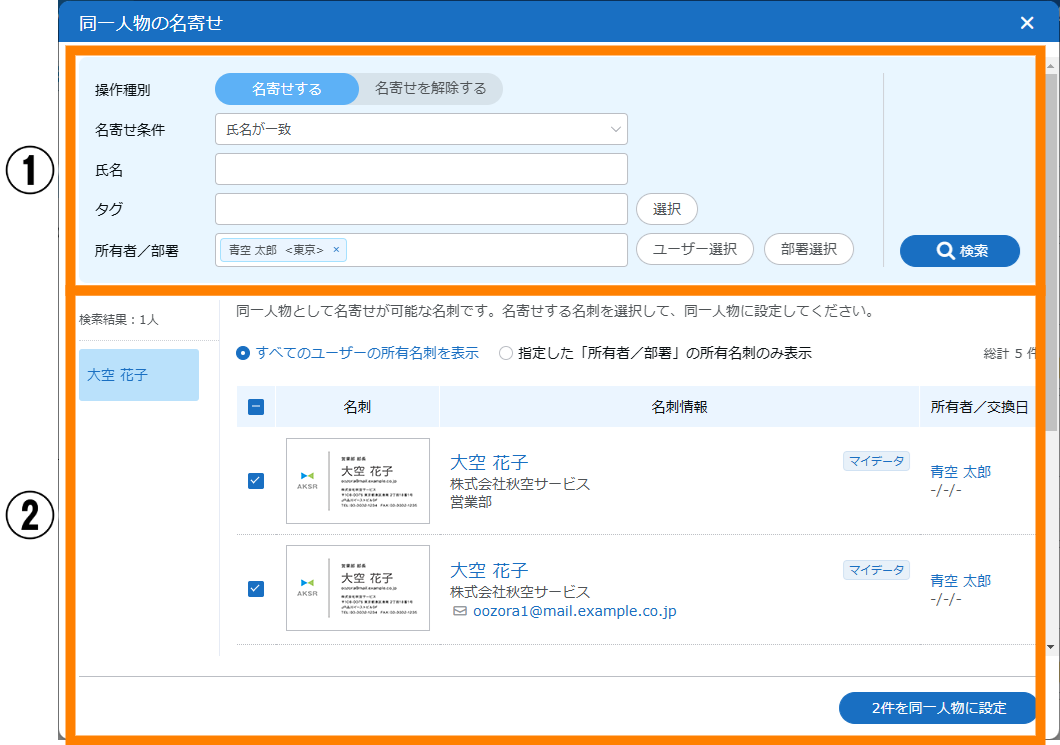 - 「検索対象(同一人物の検索対象結果)」で「名刺所有者毎の最新を表示」または、「組織全体の最新のみ表示」を選択して検索した