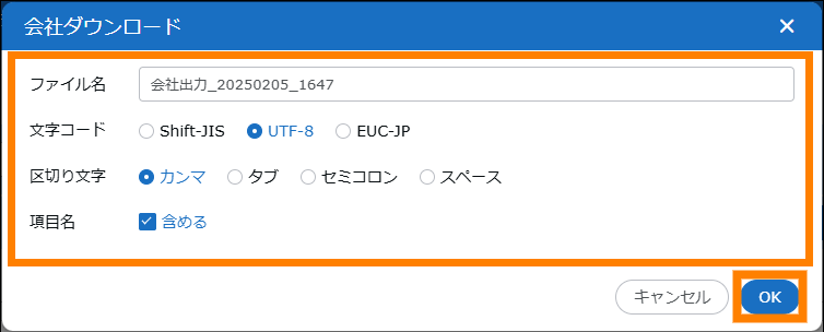 会社情報を一括でダウンロードします。ダウンロードするファイルは、文字コードや区切り文字の指定もできます。