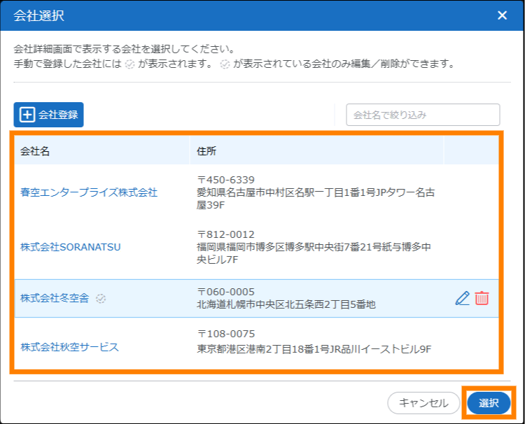 - 手動で登録された会社情報は、「会社情報」や「会社詳細」画面などの会社名に、
