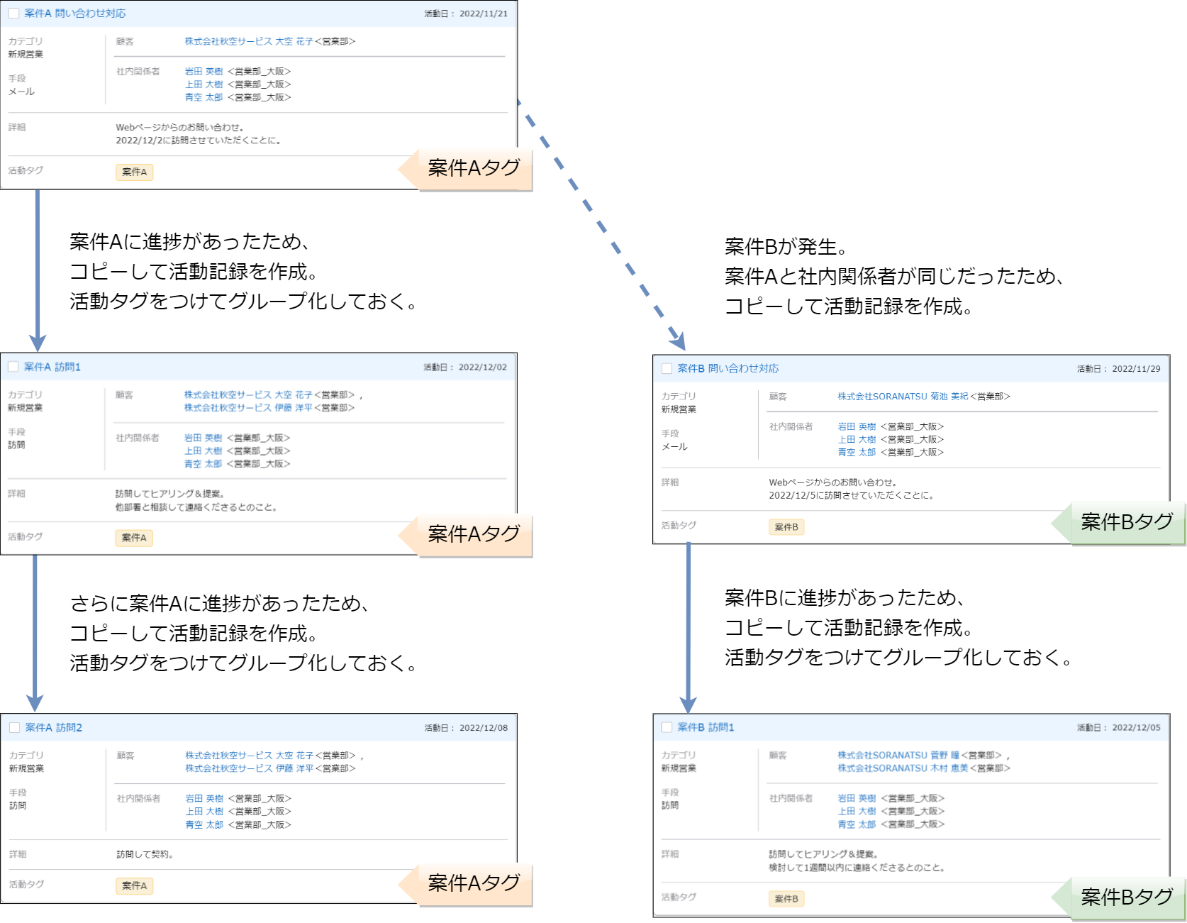 活動記録には、活動記録をグループ化して管理したり、活動の詳細を自由に入力できる機能があります。各機能の使い方の例について説明します。