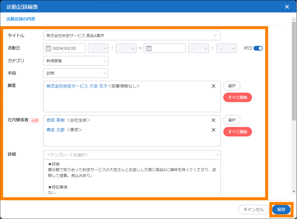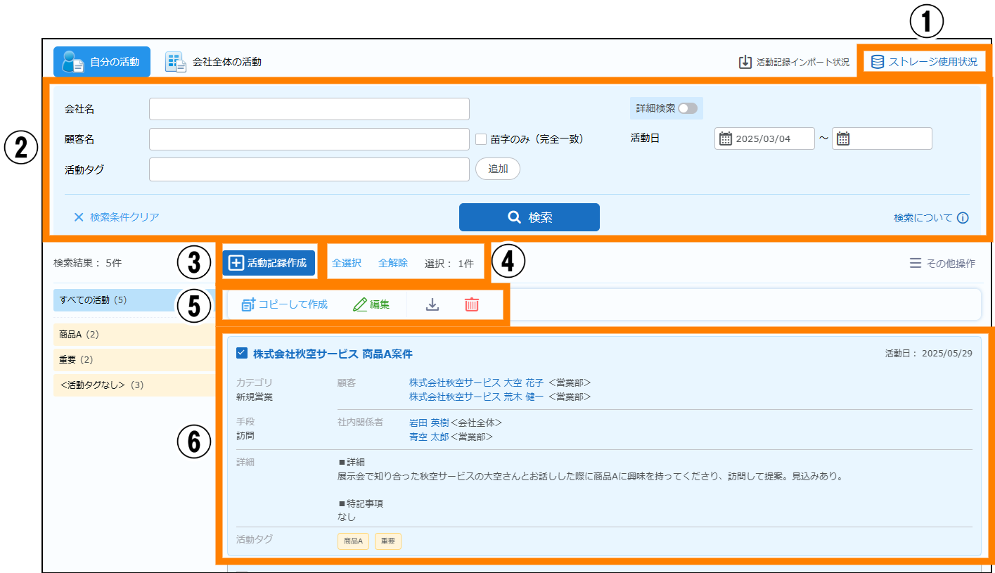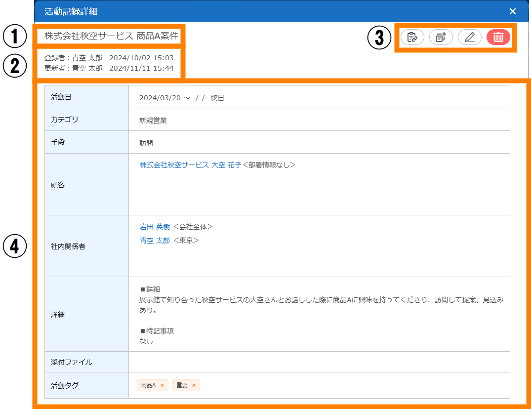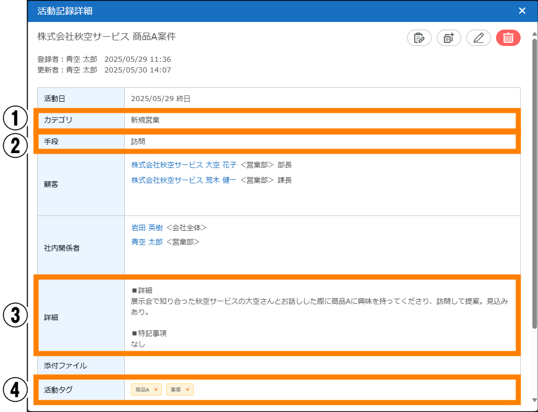| ④ | 活動タグ | 視認性や検索性を向上させるためのタグを付与します。1つの活動記録に対し複数付与できます。 例 : 「重要」「商品A」「商品B」「セミナー参加済み」「商談中」「受注見込み」 |