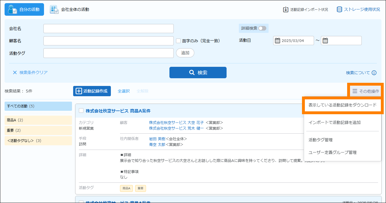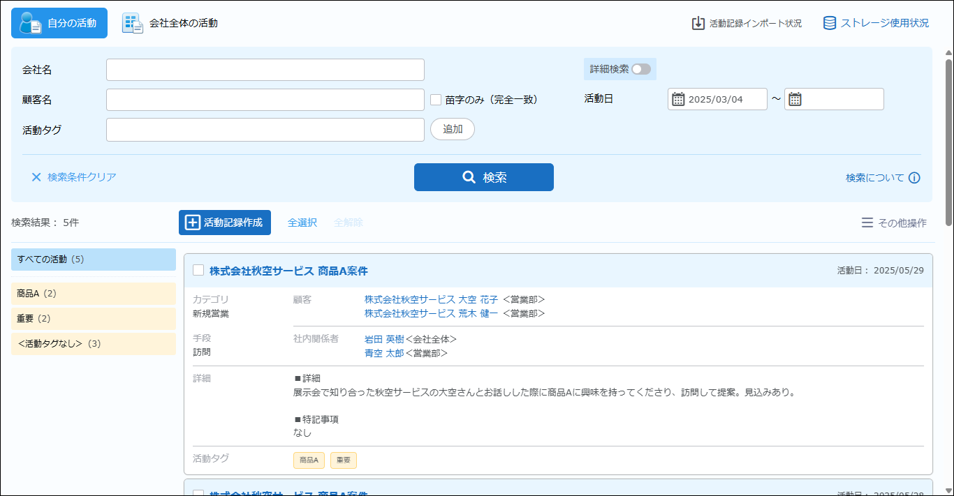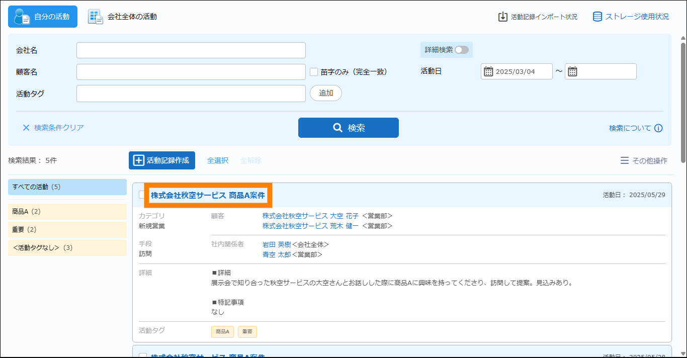 | 会社全体の活動 | クリックすると、すべての活動記録が表示されます。 | ||