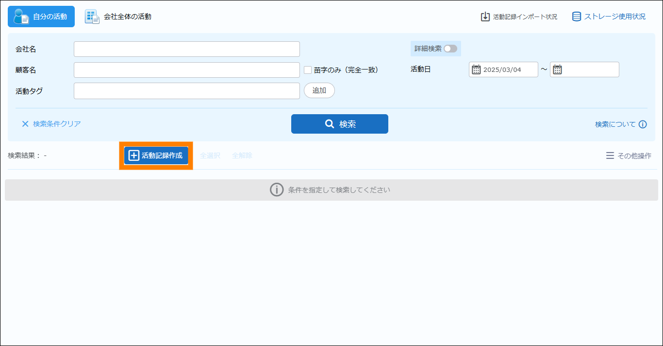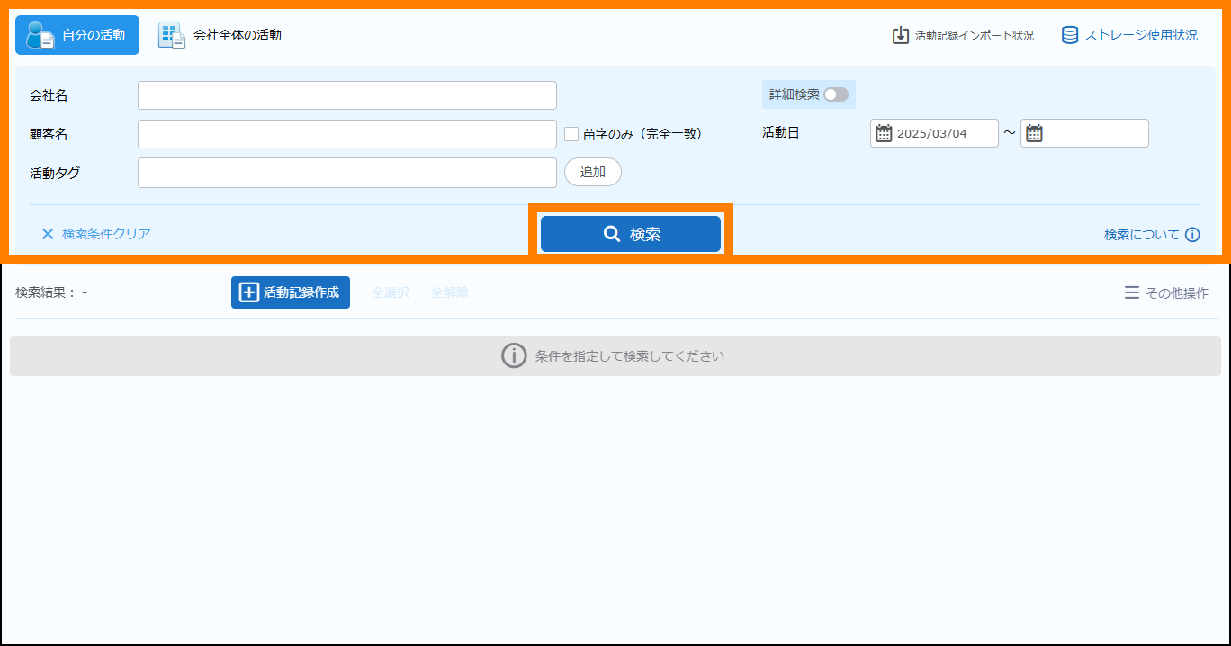 活動記録を検索・閲覧します。活動記録は、会社名、顧客名などのキーワードを入力して検索できます。また、詳細検索を使うことでさらに検索結果を絞り込むことができます。
